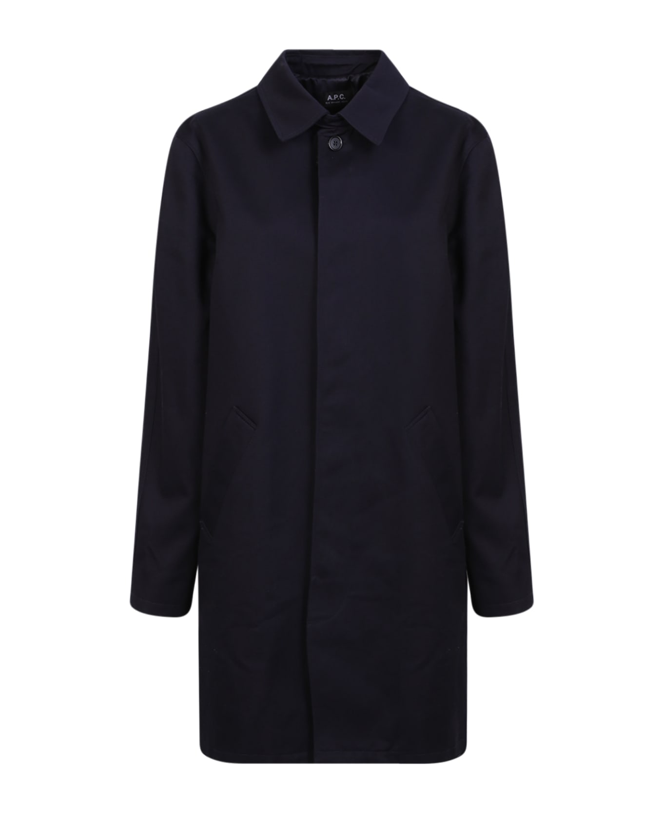 Classic collar. Long sleeves. Concelead front button fastening. Two side welt pockets. Color: blue