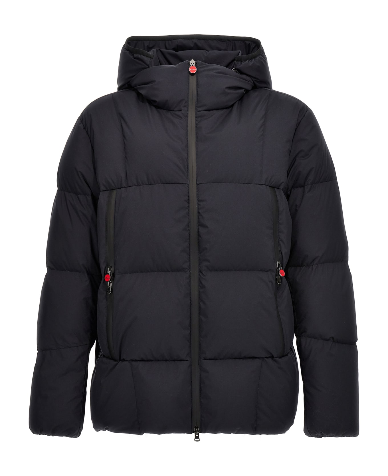 Down jacket in nylon with removable hood, down padding, zipper closure, pockets, and long sleeve.