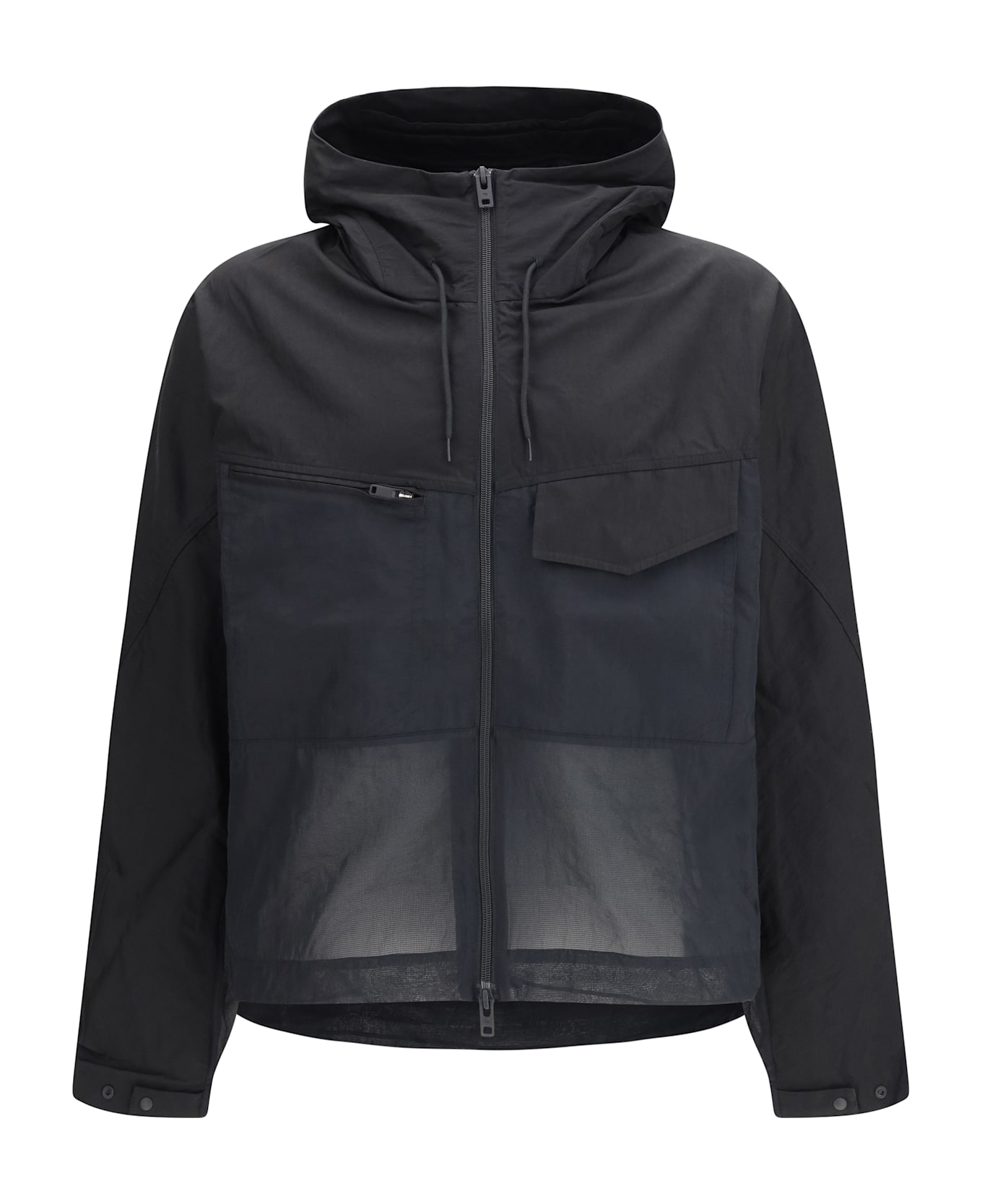 The field jacket by y-3 reinterprets utility aesthetics with a contemporary edge, combining functionality and distinctive design. cut in a regular fit, it features a two-way zip closure and a high neck with hood for optimal protection. the nylon mesh lower panel adds lightness and breathability, while adjustable bungee cords allow the silhouette to be customised. the tonal satin y-3 logo, snap-button cuffs, and practical pockets ,including a zip jetted pocket and a flap pocket with snap fastening, complete the design.
