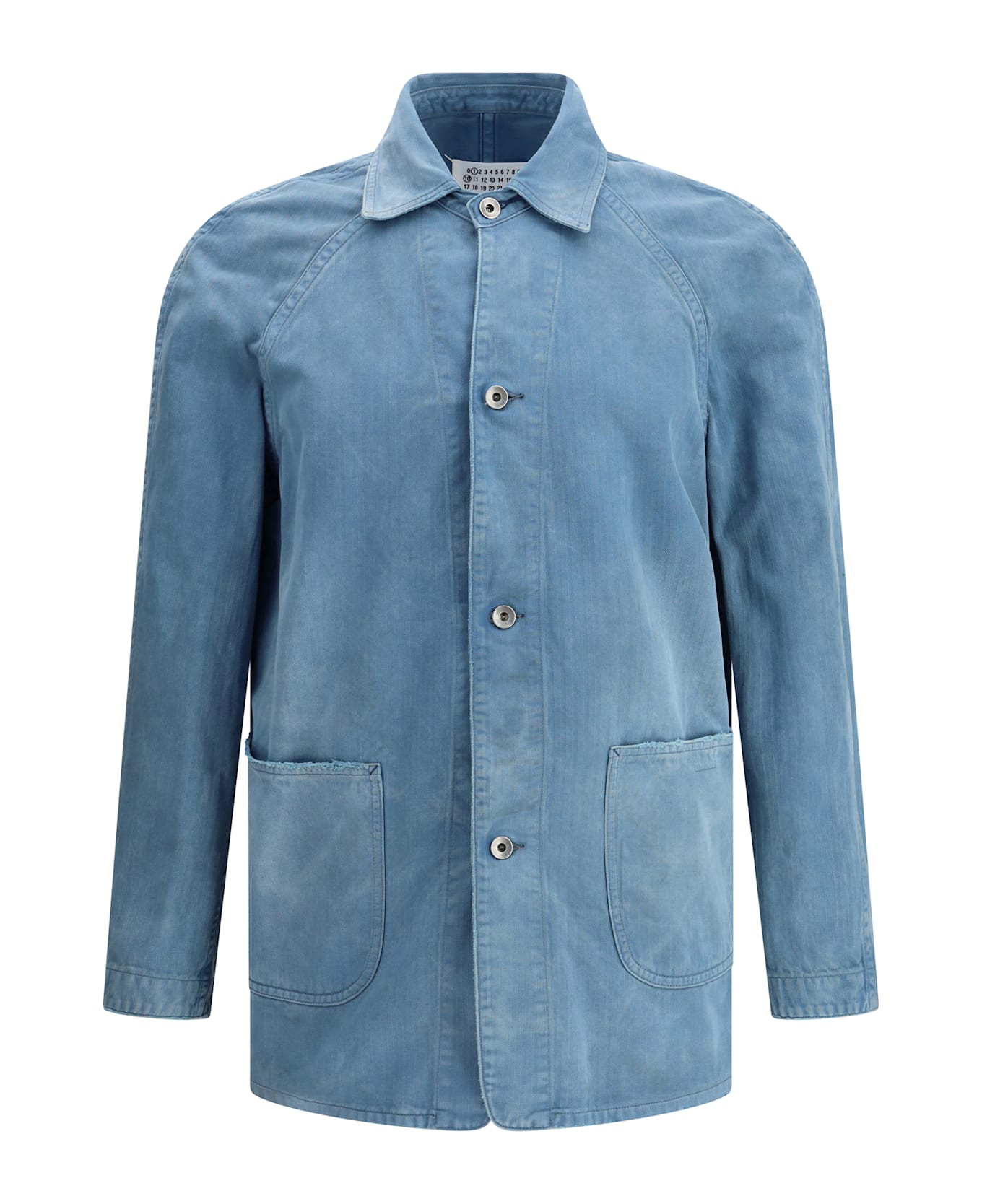 The margiela cotton jacket is a contemporary design piece, inspired by the denim shirt model. it features a classic collar that adds an elegant touch, while the front button closure ensures an easy and versatile fit. the two welt pockets applied to the front offer a practical and stylish detail, while the adjustable cuffs with a button allow you to personalize the fit. the raglan sleeves add comfort and a more relaxed look, making the jacket ideal for a casual but refined style.