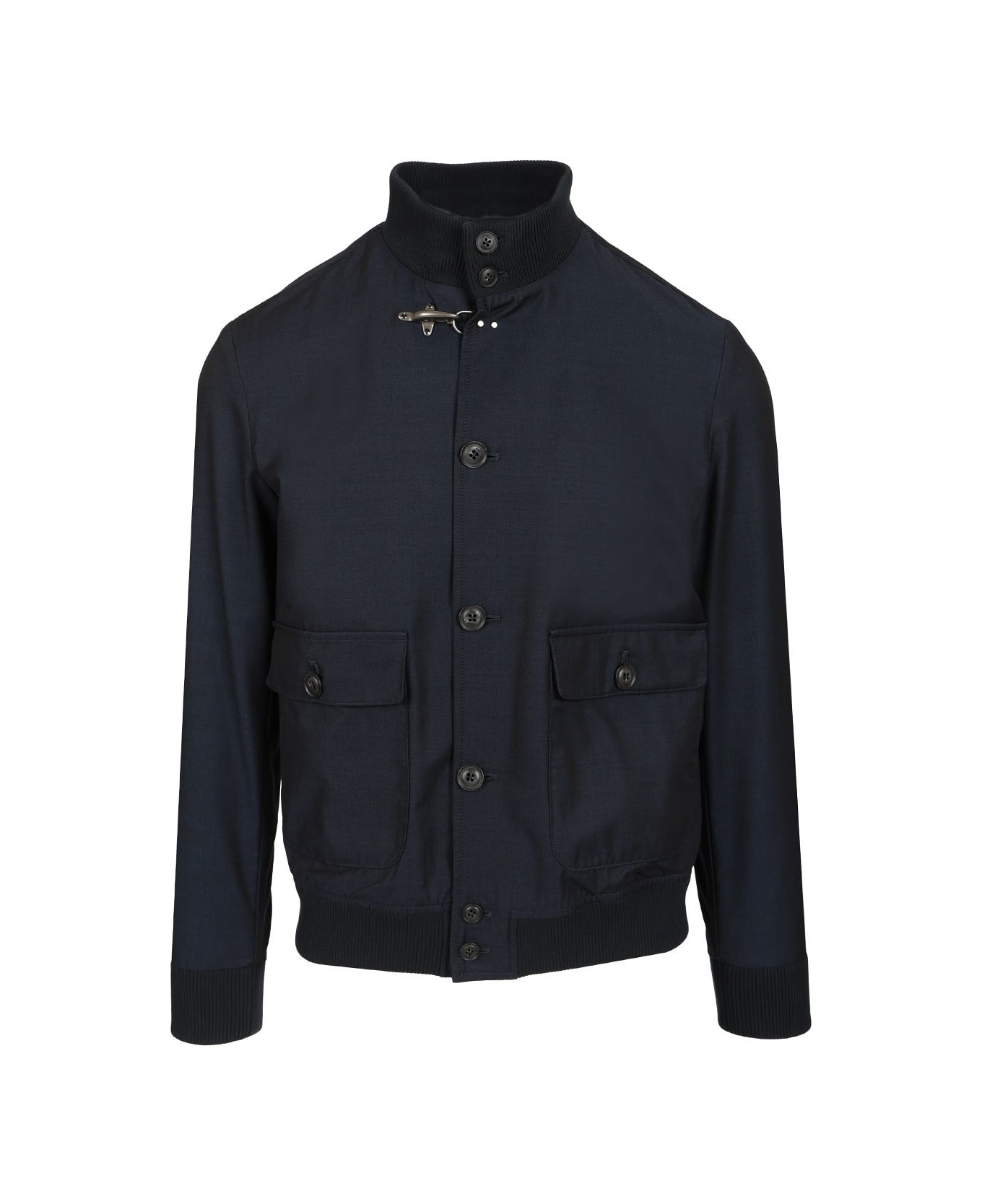Unlined bomber jacket made of cotton and wool twill, with a stand-up collar. Featuring ribbed cuffs and bottom hem, it features a closure with custom buttons and an iconic hook at the collar, maxi patch pockets with flap and button.