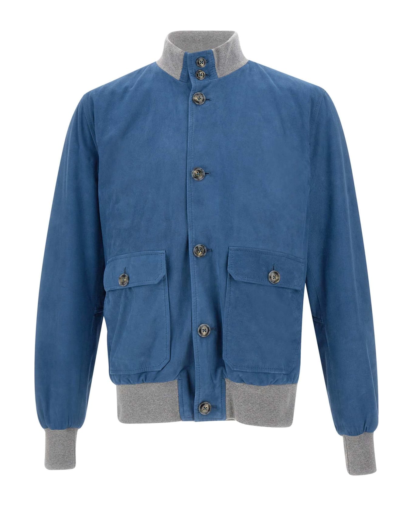 "Vermont" Barba men's suede jacket, blue, extrasoft to touch and to wear, standing collar, button closure, front pockets with flap and button, ribbed hems in contrasting grey color and fabric, lined, internal pocket, regular fit. Made in Italy.