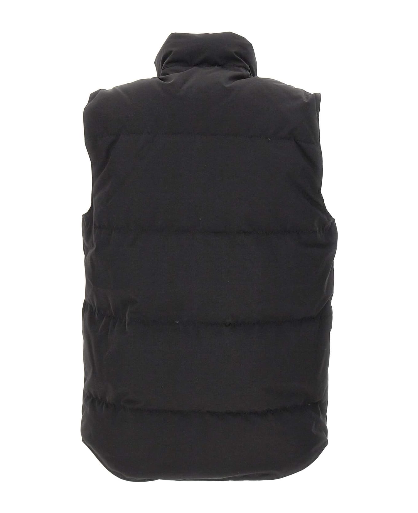 Canada Goose "Freestyle" men's vest, black colour, matte finish, padded with down, rounded collar and suede tricot lining for warmth and comfort, THERMAL EXPERIENCE INDEX technology, front closure with logoed double-slider zip and buttons, four front pockets , iconic red logo patch on chest, ideal for autumn and winter seasons, slim fitting. Every Canada Goose item purchased from an authorized retailer is fully guaranteed against defects in material and workmanship for entire life of product itself.