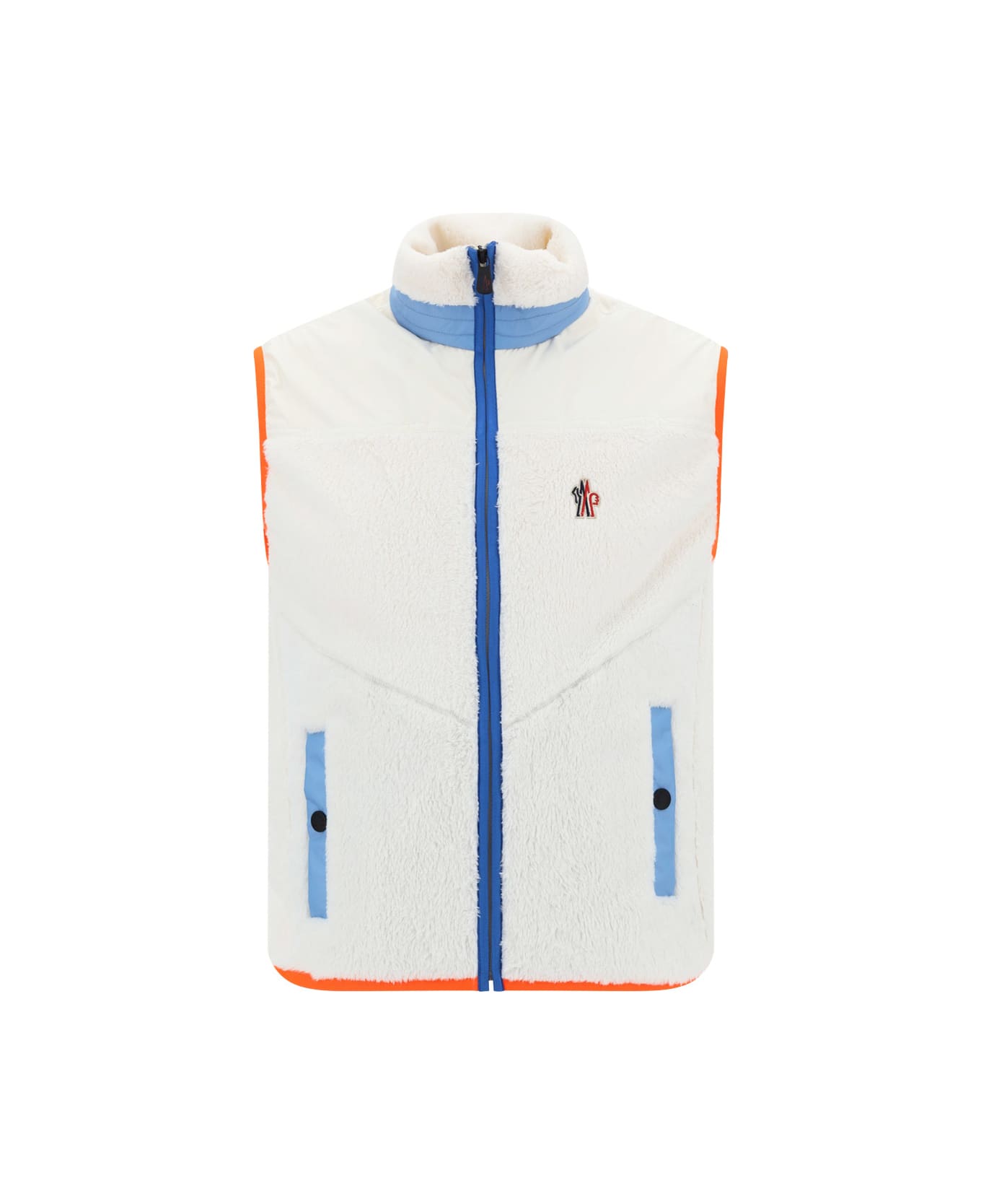 Vest by moncler grenoble, high neckline with contrasting band, front zip fastening, iconic brand patch embroidered on the front, two side welt pockets, bouclé fabric, monochrome pattern with contrasting details.
