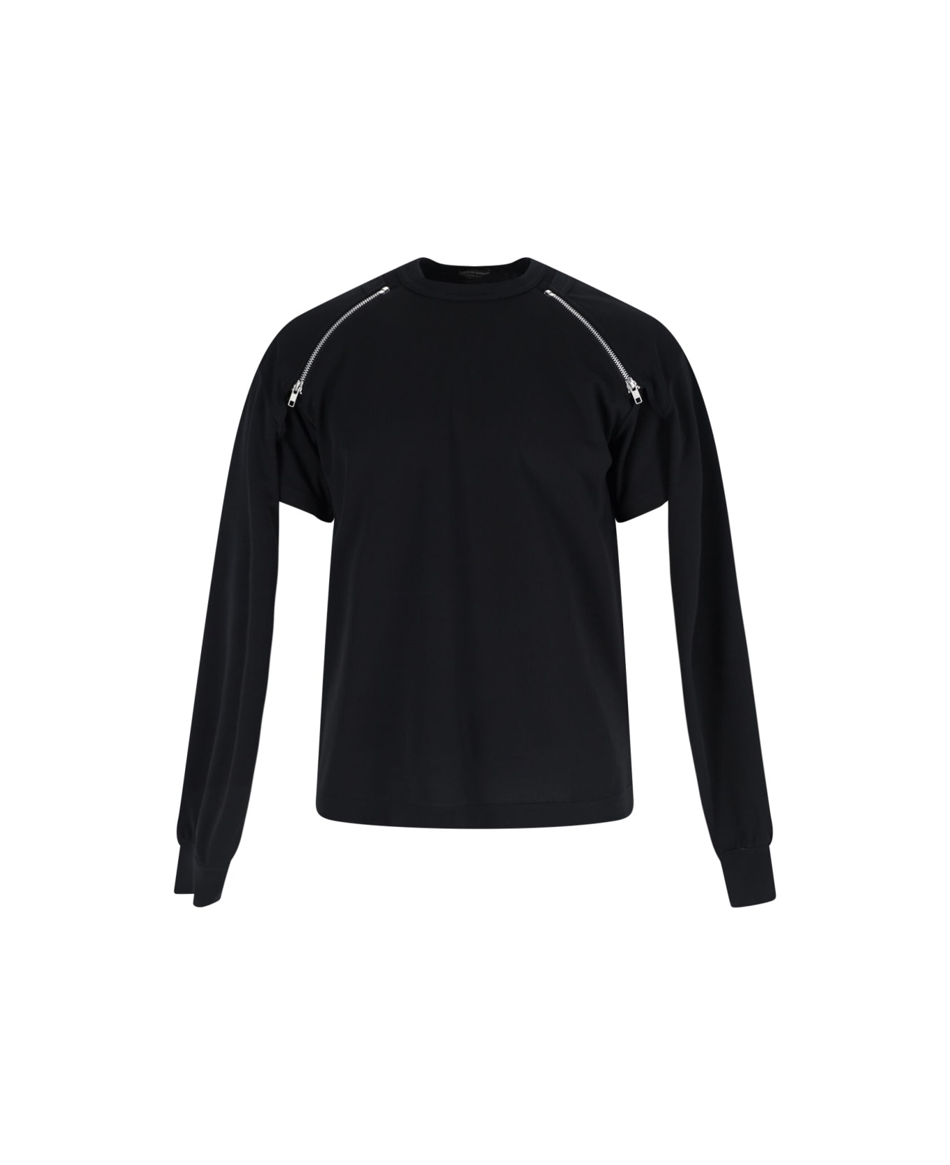 Comme des Garçons Homme Plus convertible sweatshirt in black fabric with crewneck, removable long interlocking sleeves, convertible t-shirt detail, adjustable zip on sleeves, ribbed trims, straight hem.