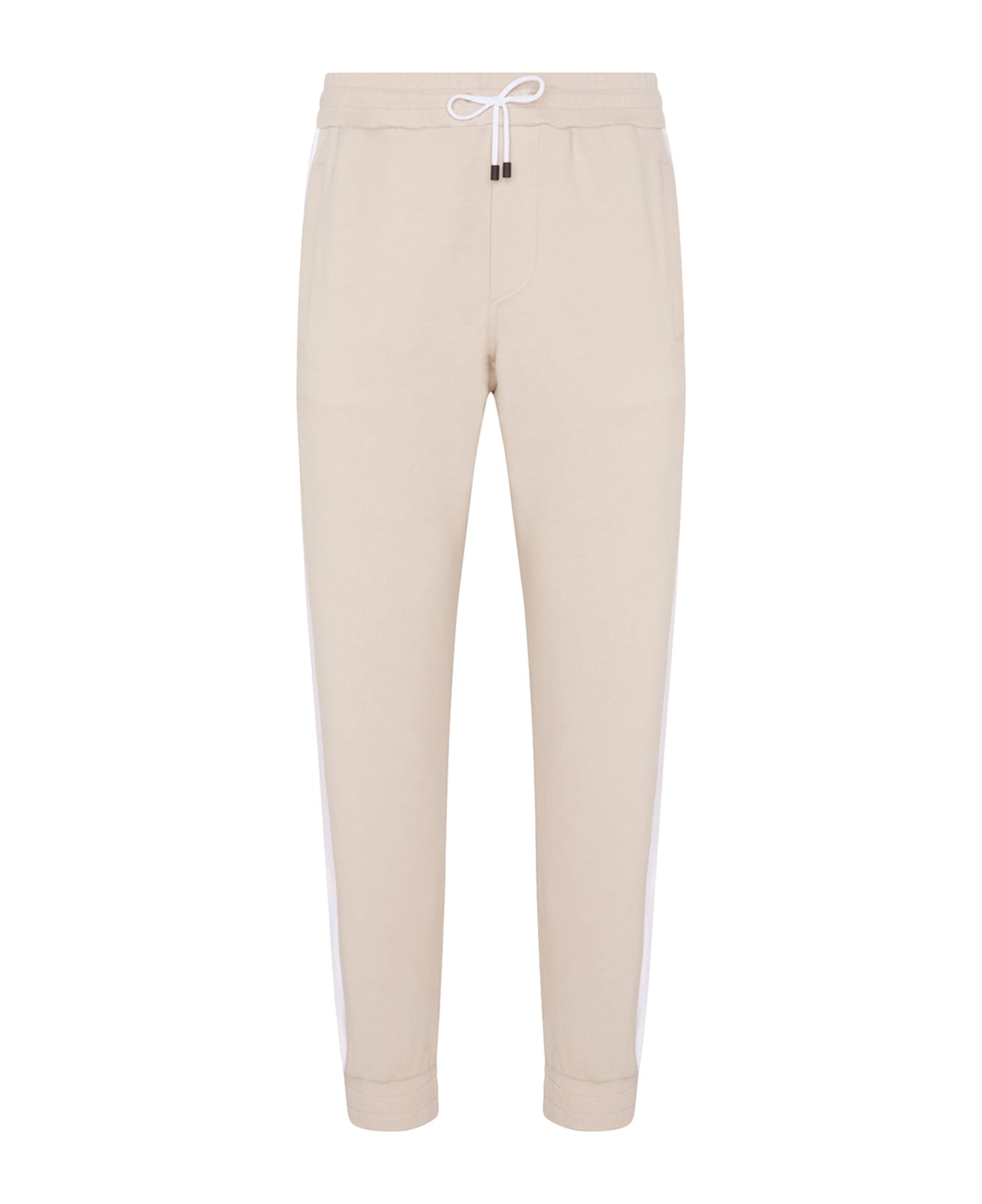 Jogging trousers in beige with white band details, made from luxurious cotton jersey. The breathable, easy-care fabric is extremely lightweight and comfortable, while the inner gauzing makes it warm for winter. The garment has two vertical pockets on the sides and a patch pocket on the back. To maintain the beauty of your Kiton garment, we recommend professional laundering and pressing.