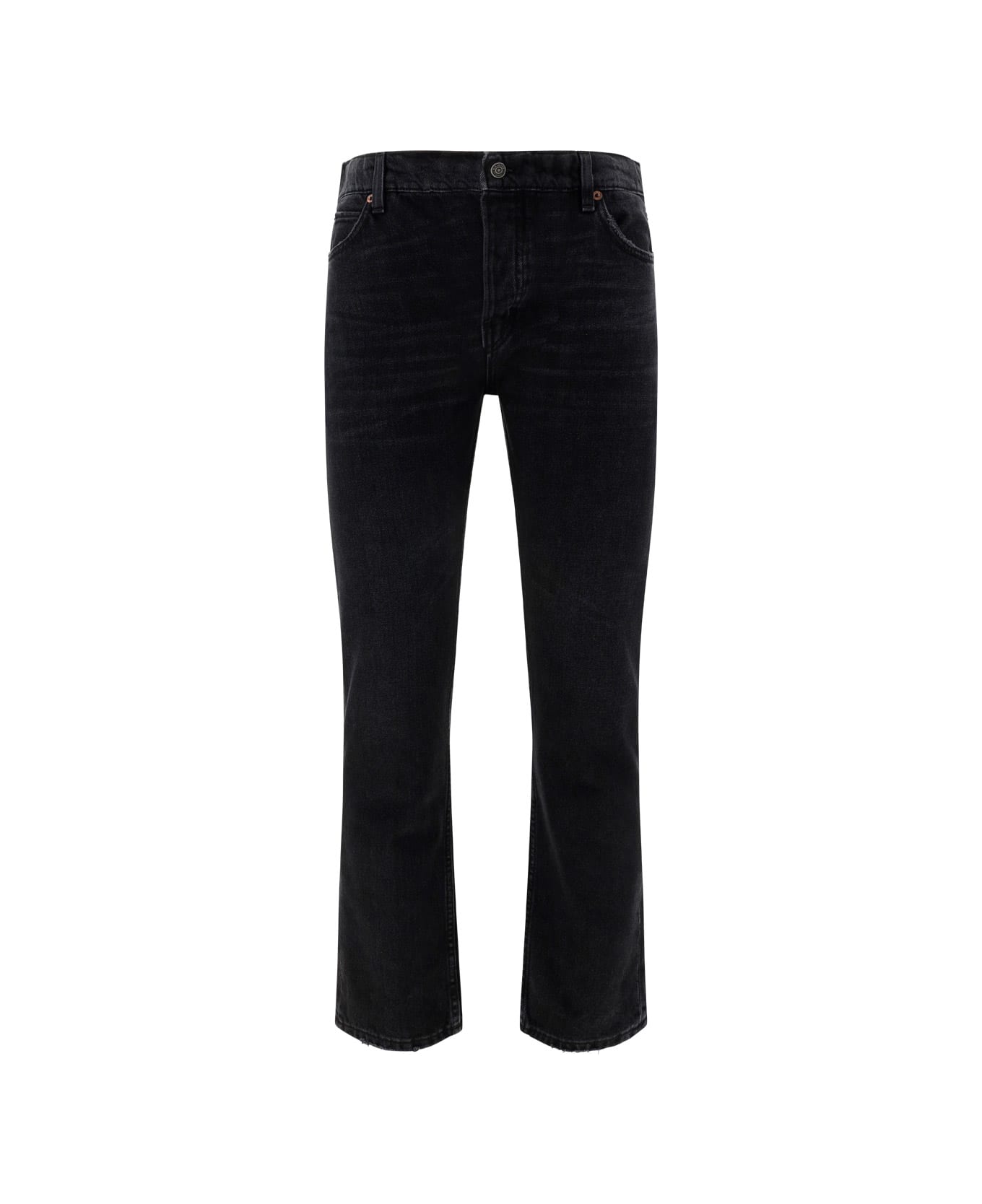 Cotton california jeans by haikure, five-pocket straight style, front button closure, belt loops waistband, iconic leather patch with brand signature pressure-printed applique on back.