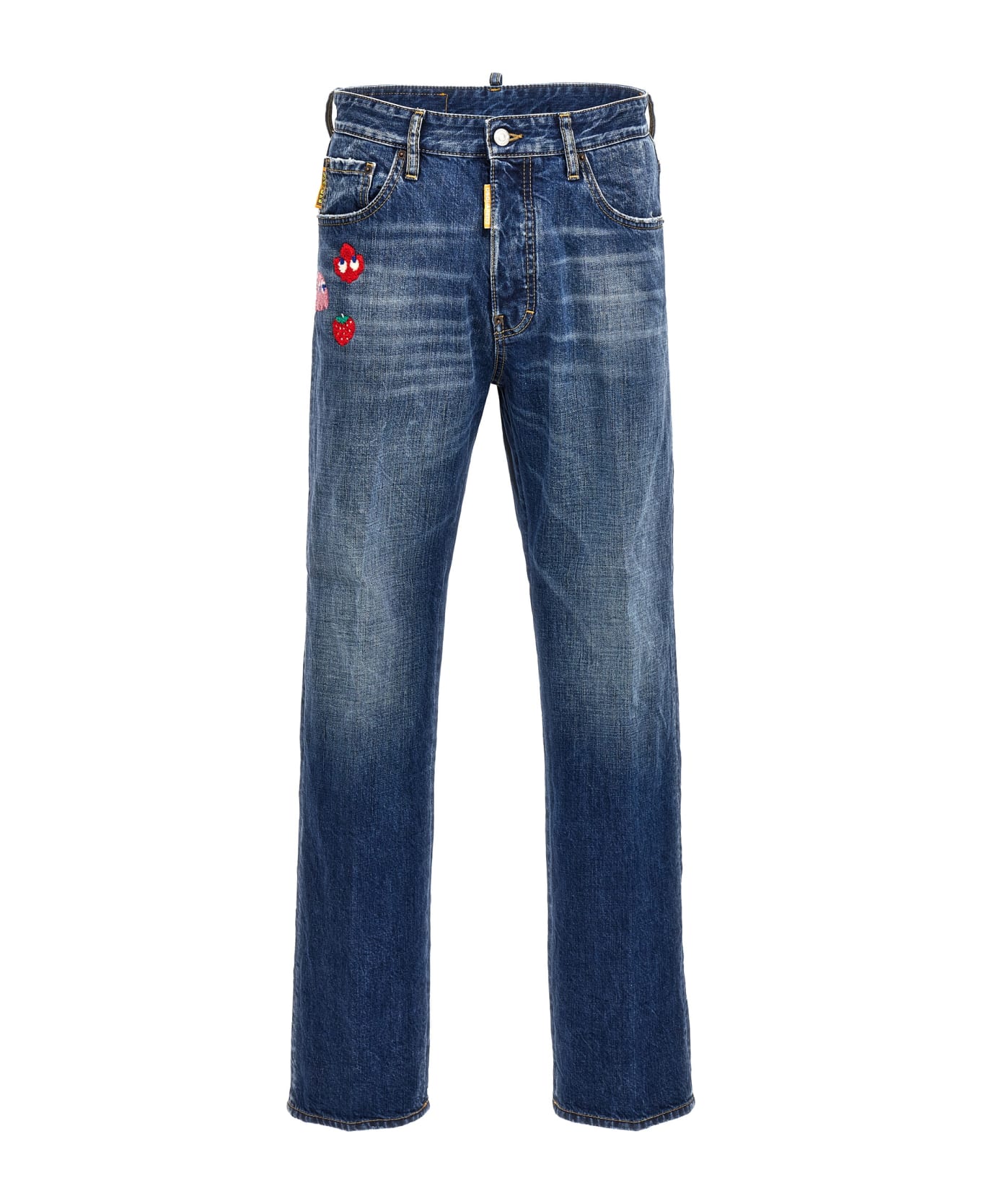 'Pac-Man 642' cotton denim jeans with used-effect details and embroidery, button closure, five pockets.