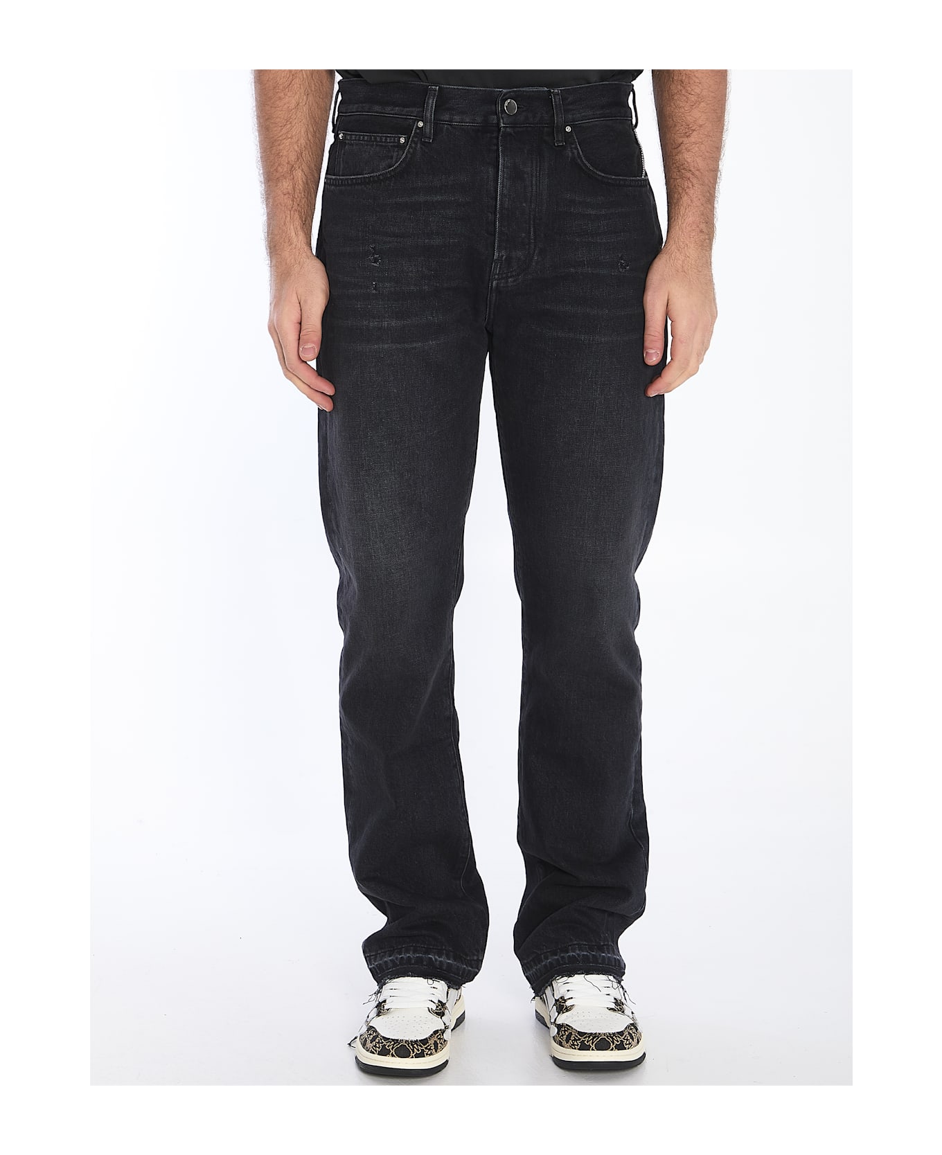 Straight jeans in black vintage-effect cotton denim. They feature a button closure, five pockets, belt loops, frayed hem, a black patch with the Amiri logo, and a silver-tone metal logo tag on the back.