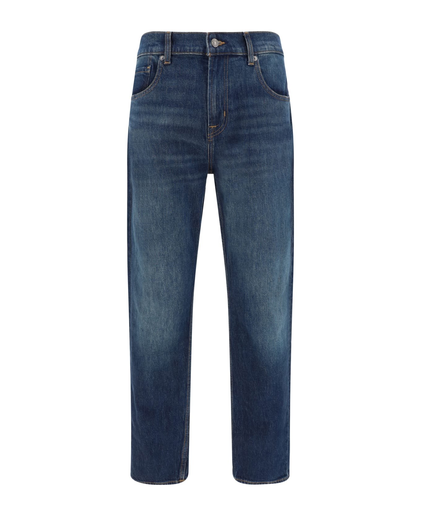 Cotton the straight threadlike jeans by 7for, five-pocket straight style, front button and zipper closure, waistband loops, iconic leather patch with brand signature pressure-printed applique on back.