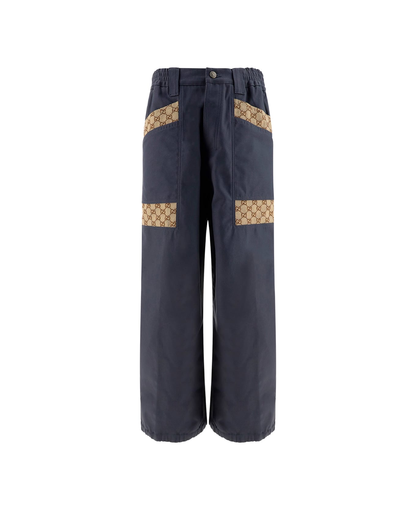 Cotton cargo pants by gucci, front button fastening, belt loops for waistband, geometric inserts with the brand's iconic gg supreme pattern, four welt pockets on the front, two patch pockets on the back.