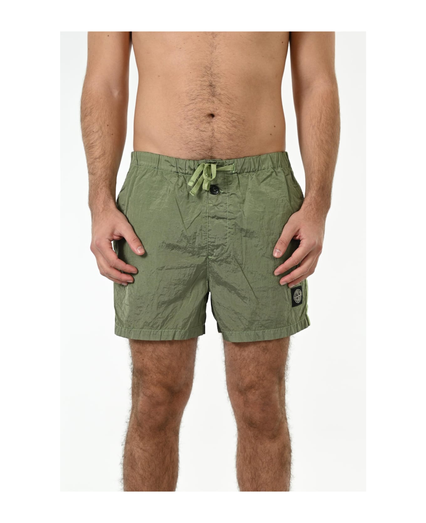 costume da bagno stone island in econyl nylon rigenerato tinto in capo, tasche a filo, tasca posteriore con velcro, elastico in vita con coulisse e chiusura con bottoni, patch rosa dei venti sulla gamba sinistra, fettucce in nylon laterali, slip interno in rete. composizione: 100% poliammide.
