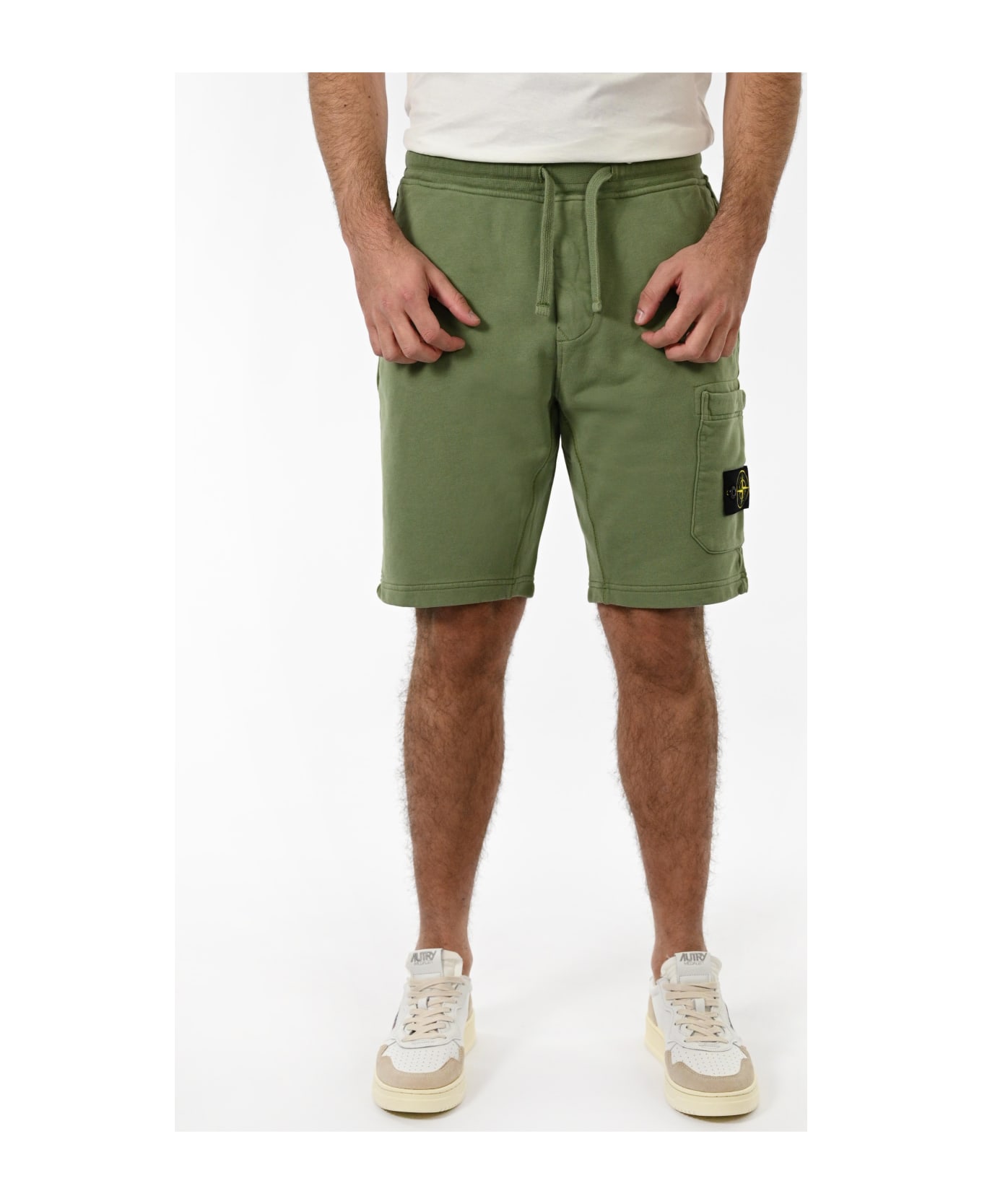 welt pockets. one pocket with hidden snap on the back. patch pocket on the left leg, with stone island badge; hidden zip closure. elasticated waist with external drawstring. zip closure. details