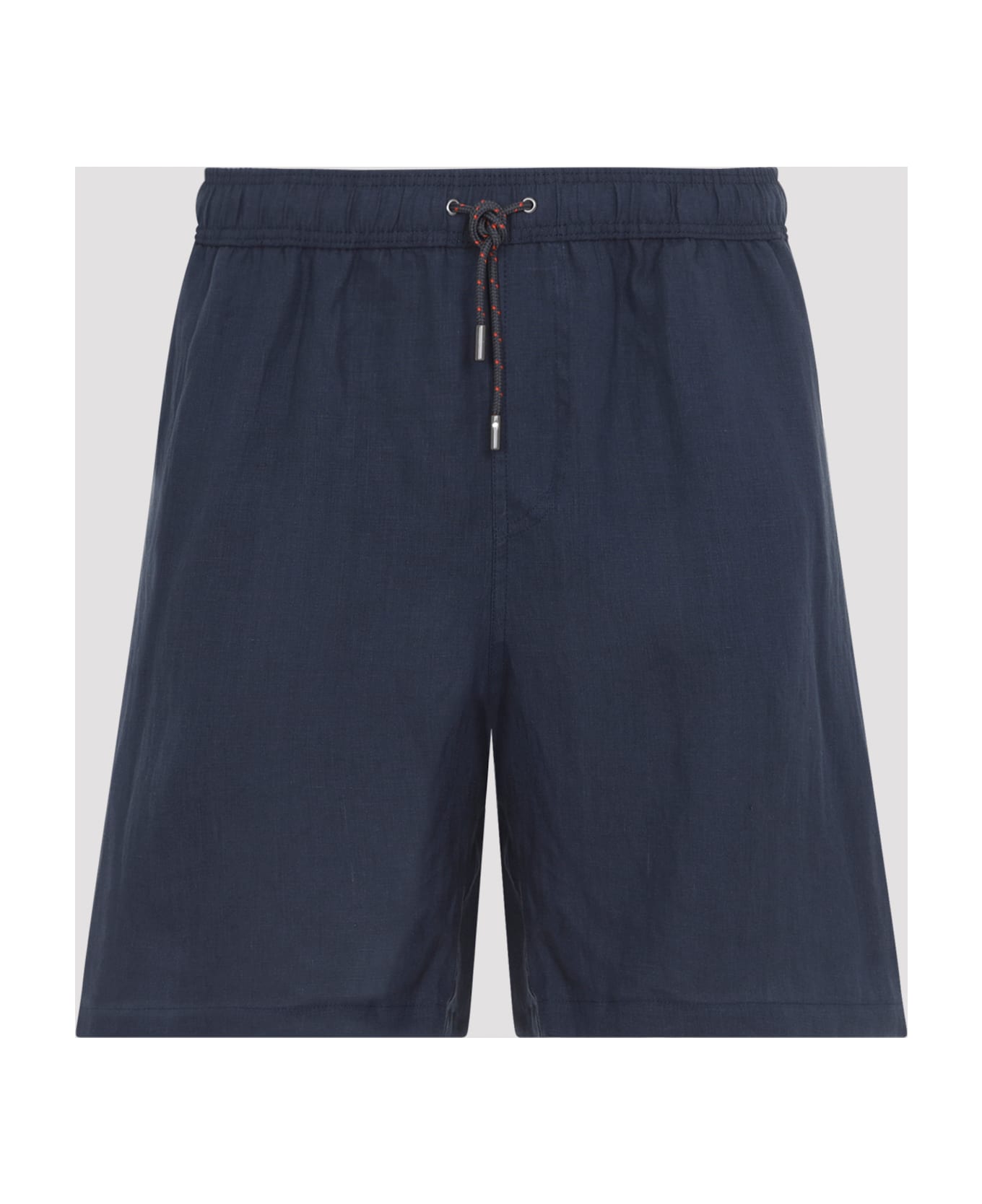 Sease Navy Blue Hemp Drawstring Shorts. Pure navy blue hemp shorts, elastic waist, front drawstring details, side pockets, back slit buttoned pocket, straight hem.