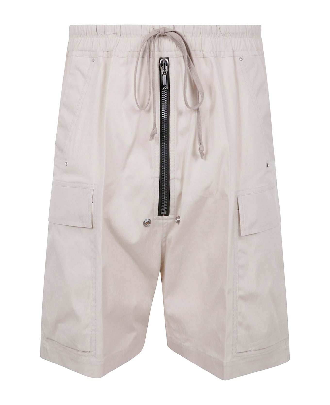 Cargobela Shorts In Beige Tech Faille, Knee-Length, With A Low Crotch And Wide Leg, Elasticized Waistband With Drawstring And A Bela Exposed Center Zipper With Two Snap Detail, At Bottom. They Feature Two Beveled Cargo Pockets On The Side Leg With Two Rear Welt Pockets, All With Concealed Snaps And Topstitching