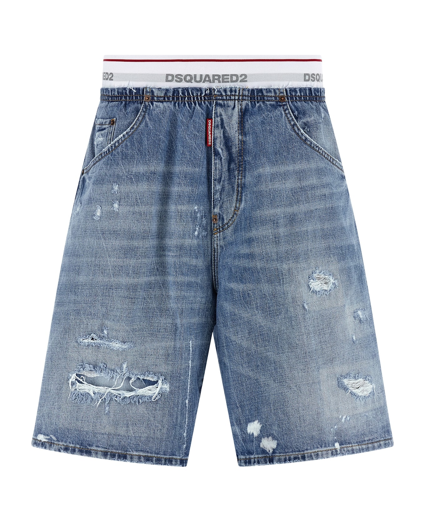 'Surfer' 13 oz stone washed used-effect cotton denim bermuda shorts with destroyed details, contrast stitching, elastic insert with jacquard logo at the waist, pull-on model, trompe l'oeil flap, five pockets.