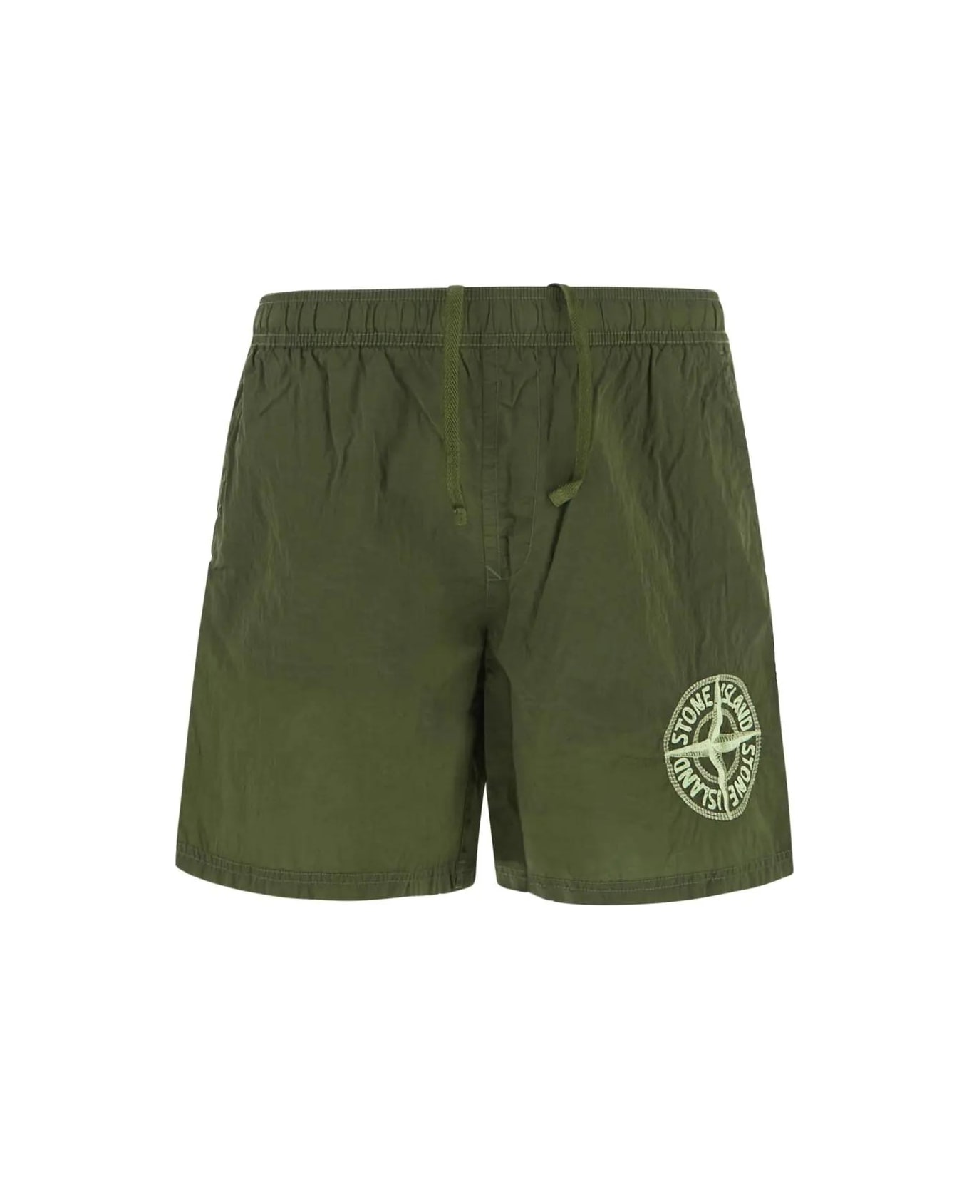 Stone Island swimming shorts in sage polyamide with tonal logo embroidery on the leg, side slanted pockets, elasticated waistband with internal drawstring, mid-length, back zipped pocket and tonal topstitching.