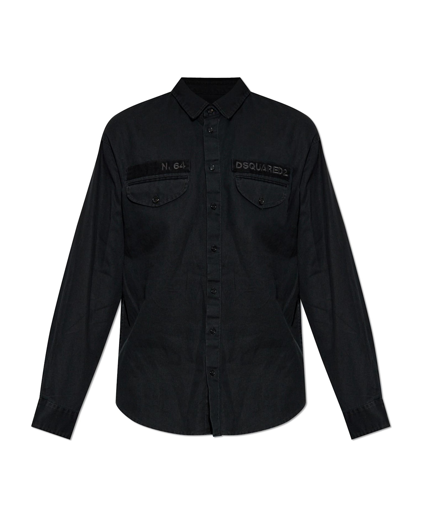 Elevate your wardrobe with this impeccably crafted black logo shirt by Dsquared2. Effortlessly blending American glamour with Italian refinement, the shirt features a timeless straight cut with subtly rounded hem, designed for versatile styling worn tucked in or left loose. The fabric boasts a refined, discreetly textured weave, exuding understated sophistication only high-quality cotton can provide. Distinctive design details include two symmetrical flap pockets at the chest, each adorned with exclusive tonal embroidery