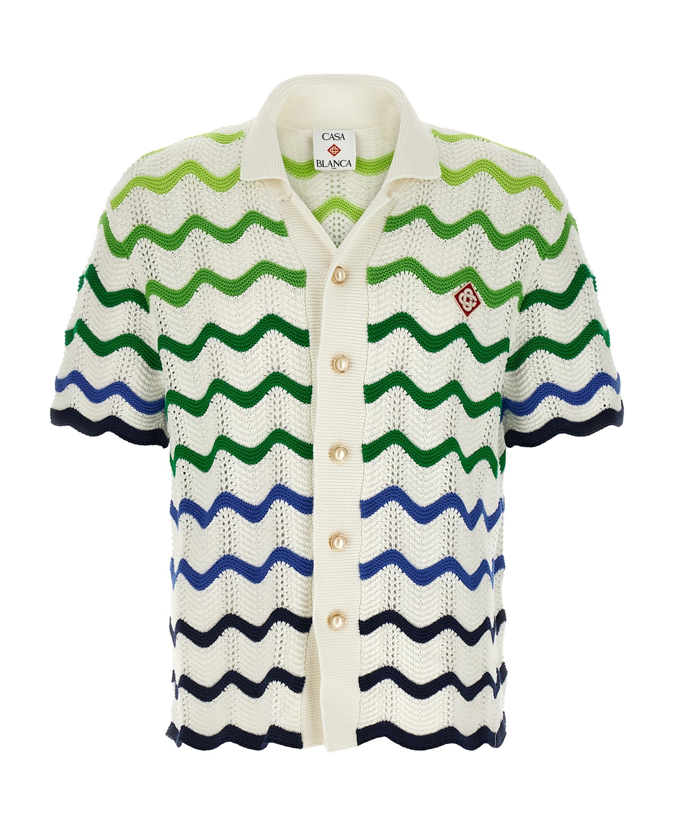 'Gradient Wave' shirt in crocheted cotton fabric with open weave and knitted gradient, logo patch and front jewel button closure, Cuban collar, short sleeves, asymmetrical hem. Composition: 100% cotton
