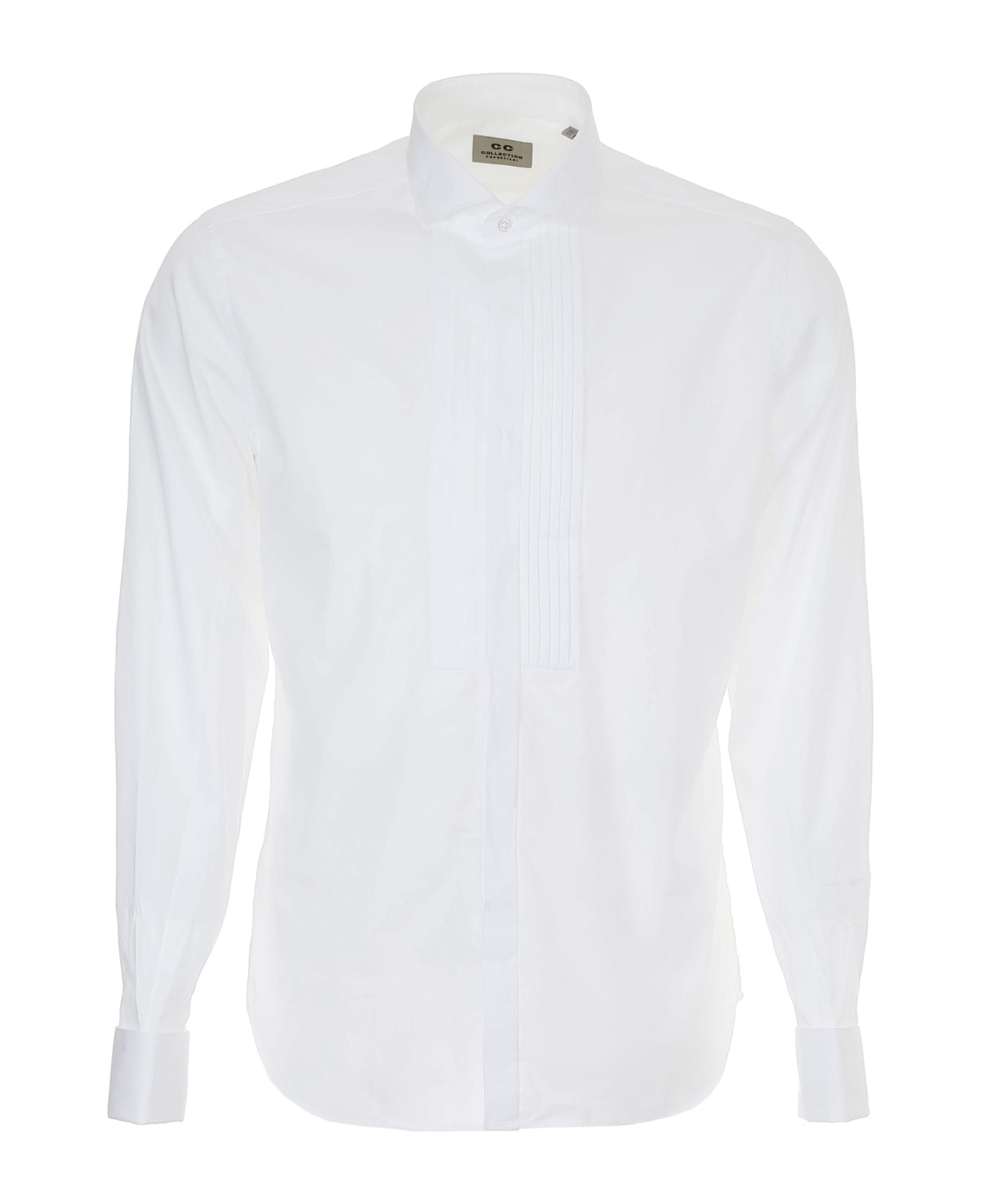 CC Collection Corneliani cotton poplin shirt with French collar and pleated plastron. Double cuffs with metal and mother-of-pearl cufflinks, concealed mother-of-pearl buttons. Darted back and round hem. Coordinated pocket square included. Model height is 186 cm and he is wearing a size 39. Composition: 100% cotone