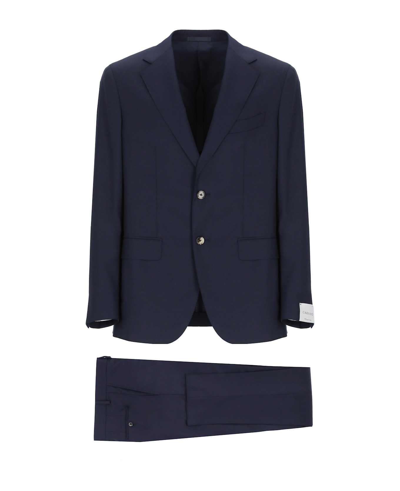 - Blue Caruso wool suit for man - Jacket with chestpocket - Peak lapel collar - Long sleeves with buttons - Front buttons fastening - Two front flap pockets - Two rear vents at hem - Pants with front buttons and zip fastening - Two side slit pockets - Two rear button pockets