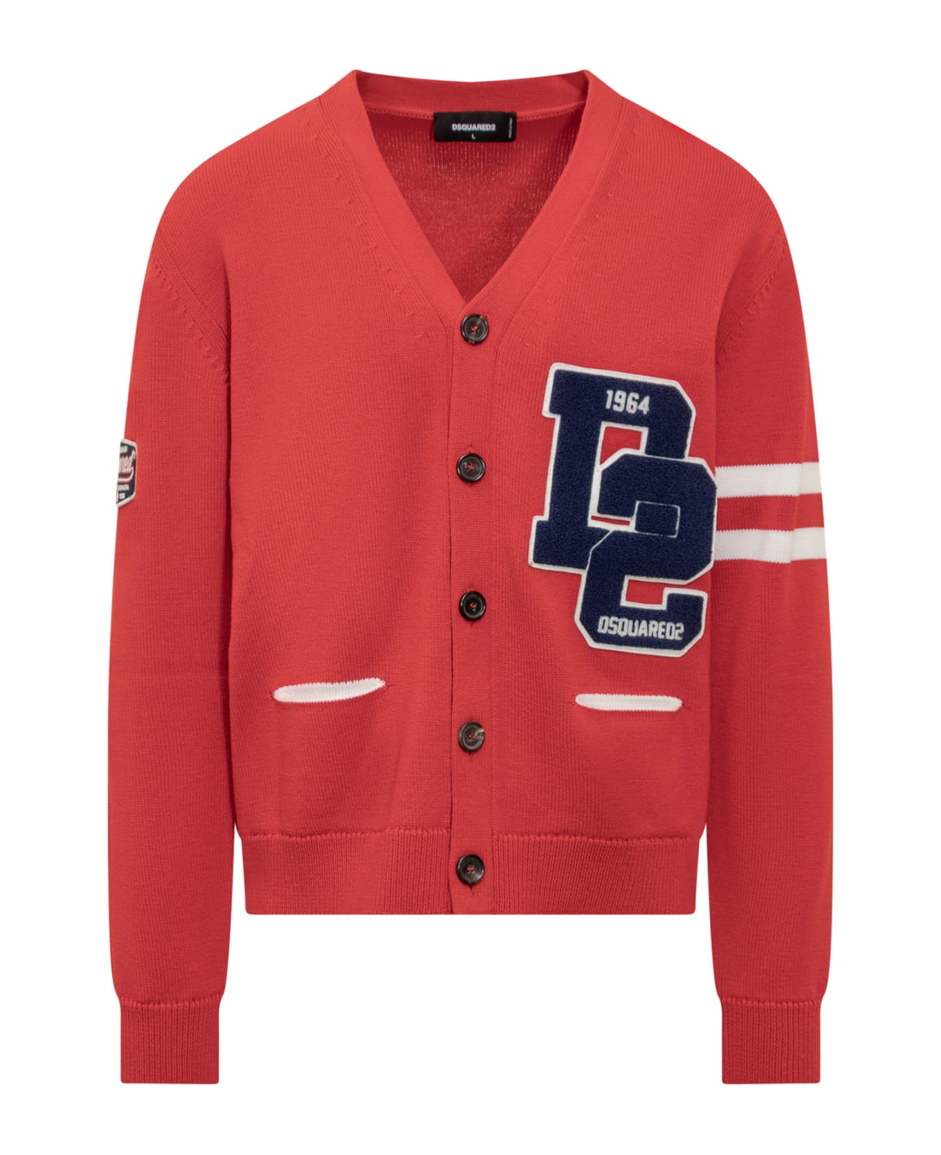 Red long sleeve pullover. V-neck. Front button closure. Embroidered logo on the front. Knitting. Ribbed cuffs and bottom.