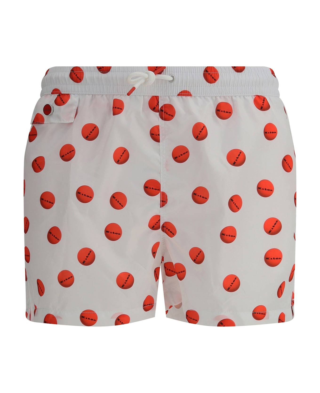 Kiton's swimshorts is an elegant and refined garment that combines style and practicality. the adjustable elastic waistband with drawstring allows for a customized fit, while side welt pockets provide space for small items. the back flap patch pocket and front flap pocket add a touch of functionality and design while maintaining a clean, sophisticated aesthetic. contrasting all-over logoed spheres make the suit distinctive and instantly recognizable, lending a touch of luxury to even a casual garment.