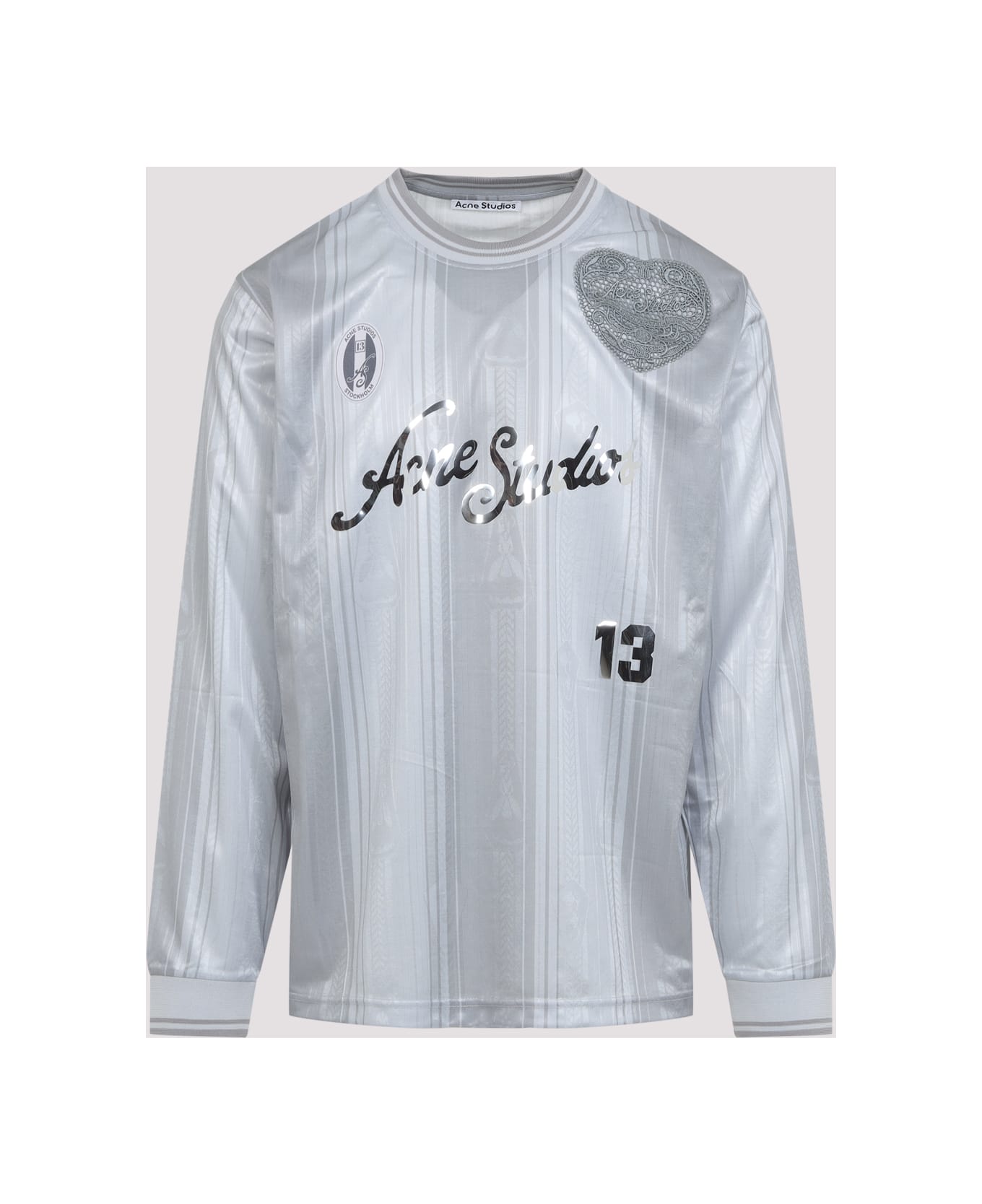 Acne Studios Grey T-Shirt. Crafted in grey polyester fabric. Round neck, front contrasting black lettering logo, front grey and black designs, long sleeves, ribbed cuffs, straight hem. Light grey and dark grey stripes pattern all-over.
