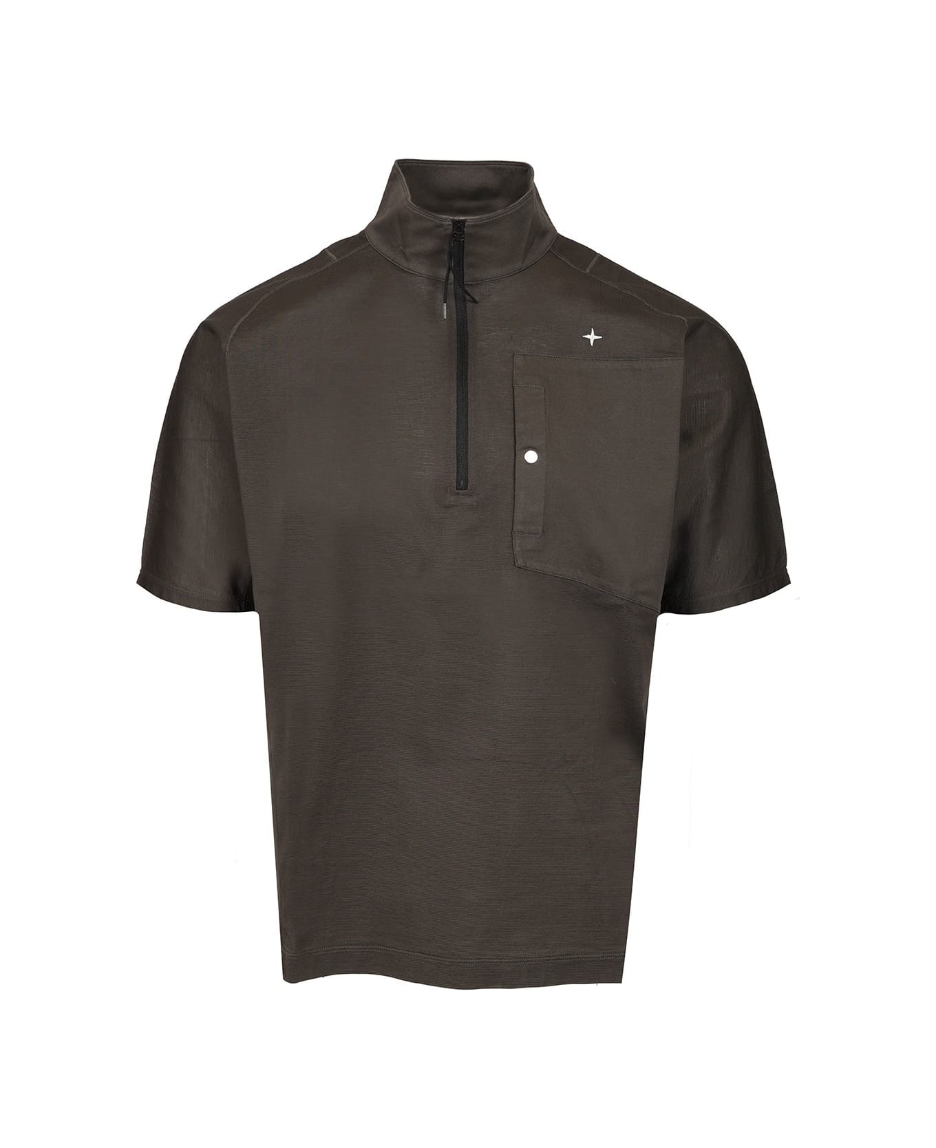 Short-sleeved polo in mercerized and textured cotton jersey. Collar lined in lightweight cotton jersey. Collar closed by a short zip. On the left collar, embroidered Stone Island star. Standing patch pocket on the chest, in lightweight cotton jersey, with snap button. Raglan sleeves. Engineered panel construction with overlock stitching. Regular fit.