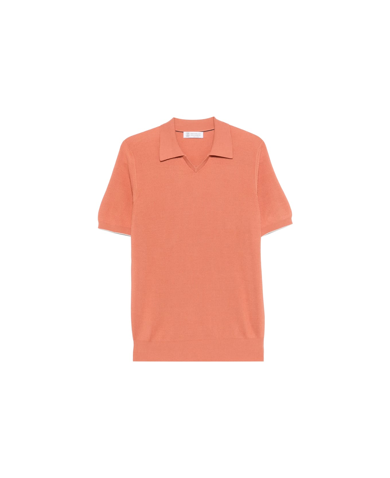 orange ribbed knit V-neck short sleeves polo collar contrasting trim