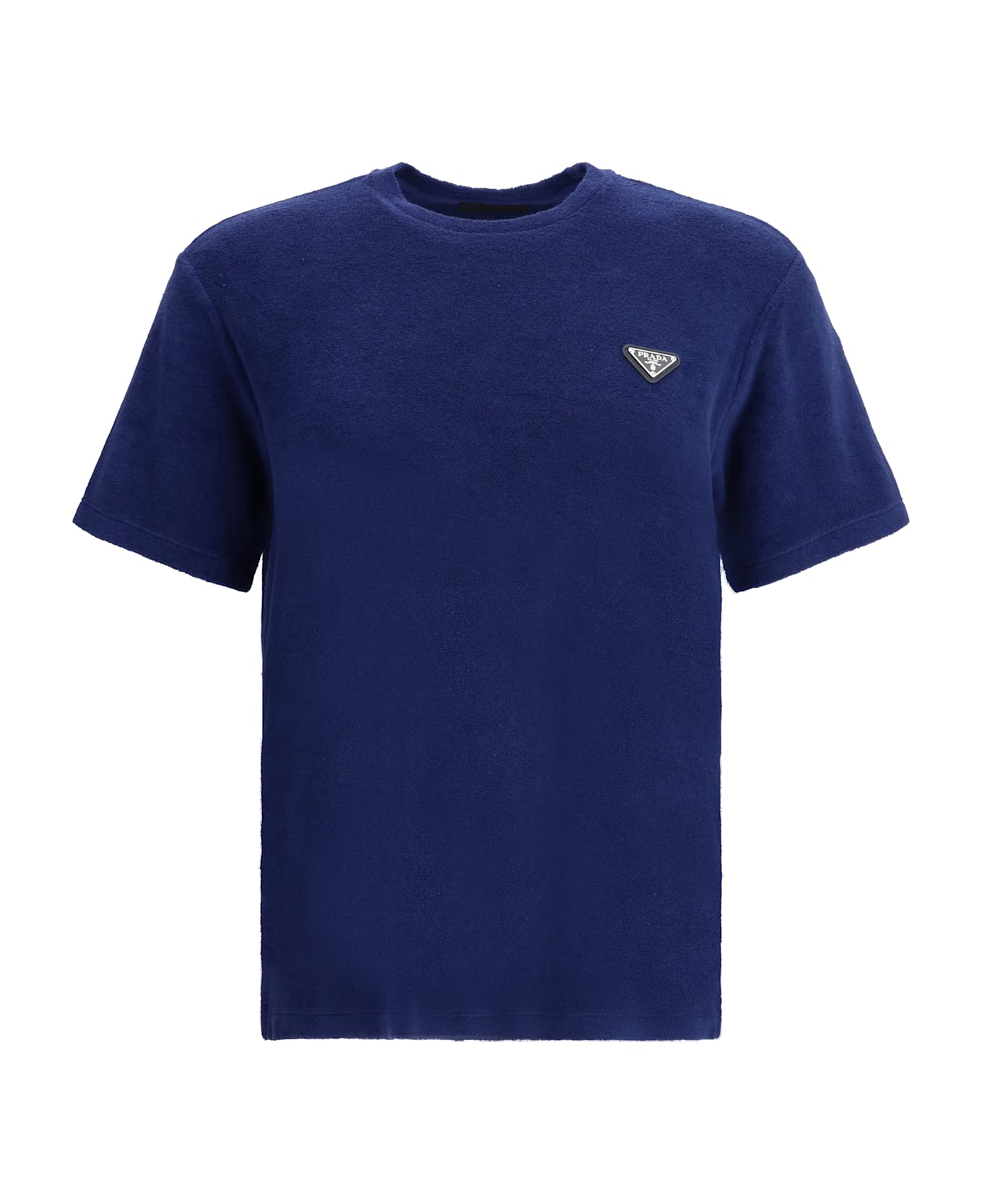 Prada's terry t-shirt is a garment that flawlessly combines comfort and style. made of terry cloth, it offers a soft texture and absolute comfort, ideal for a casual yet classy look. the minimalist design is enhanced by a plaque with the brand's iconic logo applied on the front, adding a distinctive and modern touch. perfect for those seeking a stylish yet comfortable garment that can be easily paired with a variety of styles, from a more casual day to a more refined look.