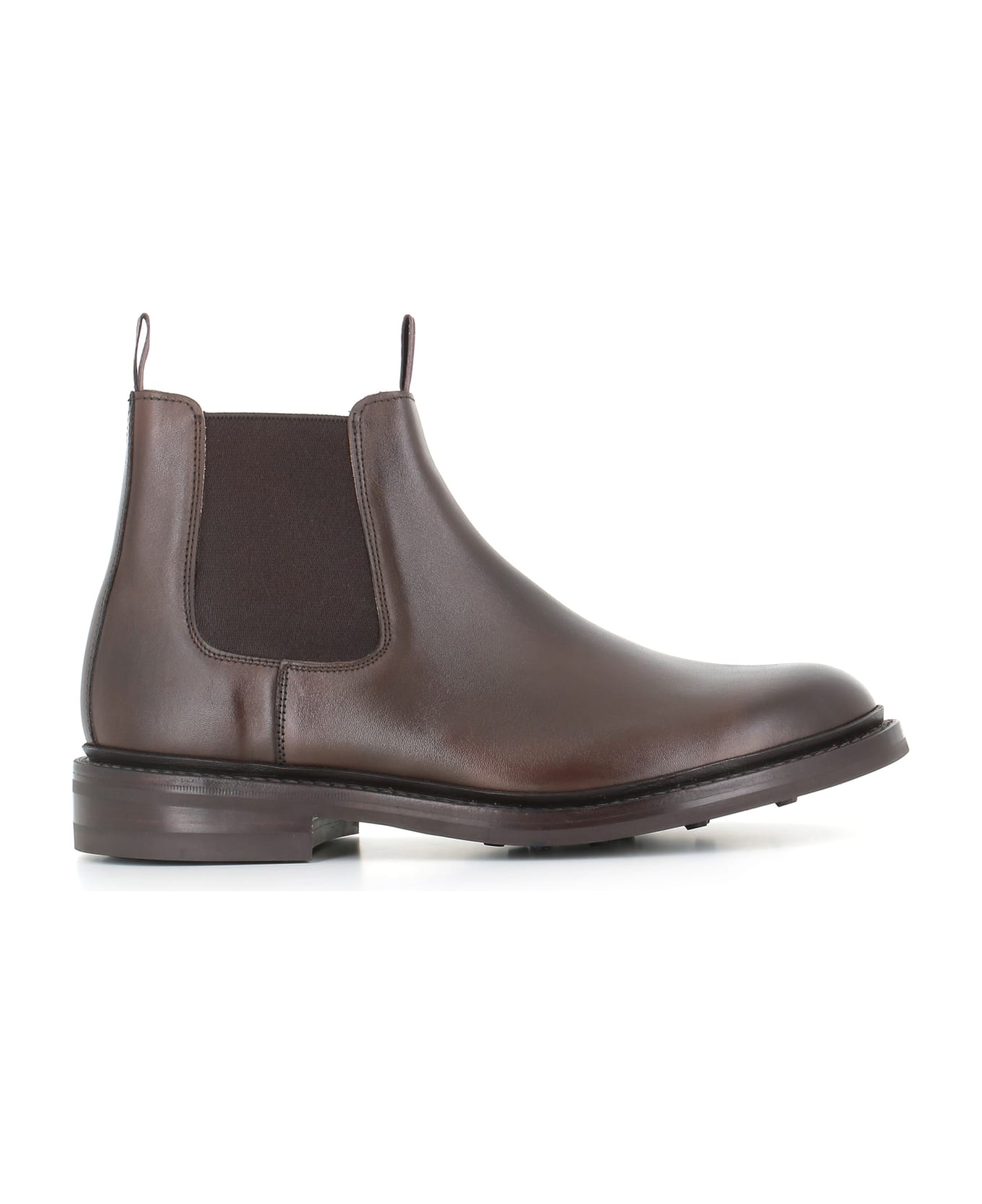 Brown leather men's chelsea by Tricker's, featuring a round toe, elastic side inserts and a welt with visible stitching. Lined interior. Double leather fund with Dainite rubber sole. 'Goodyear' artisan manufacturing. Heel: 2,5 cm