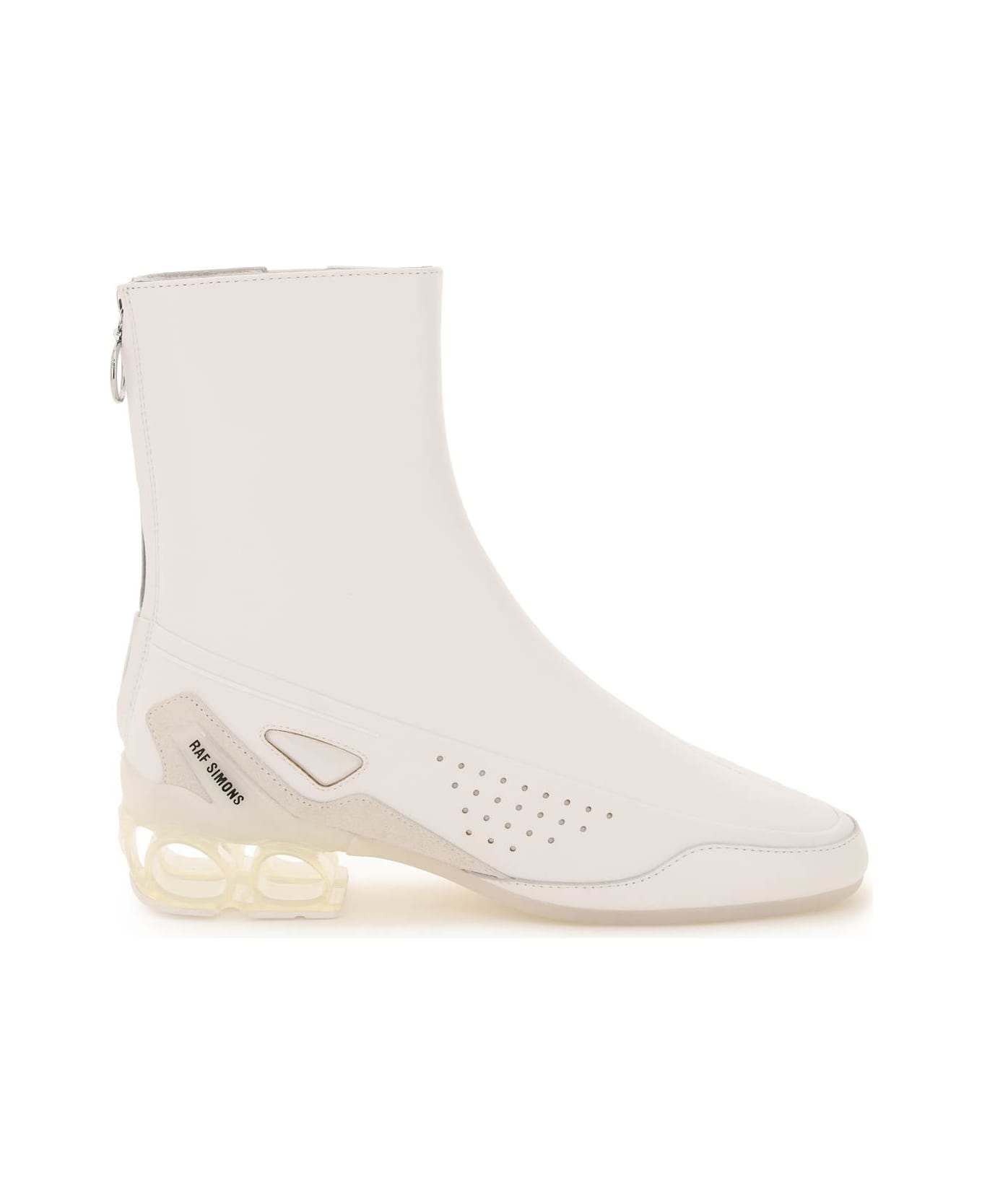 Cycloid-4 ankle boots by Raf Simons crafted in leather featuring fabric-coated base with side perforations and transparent rubber inserts. Suede leather details, heel rubber insert with contrasting logo print on the sides and on the back and cut-out heel in transparent rubber. Side elasticated panel and rear zip closure with silver-finished metal ring zip puller. Leather lining and rubber sole.