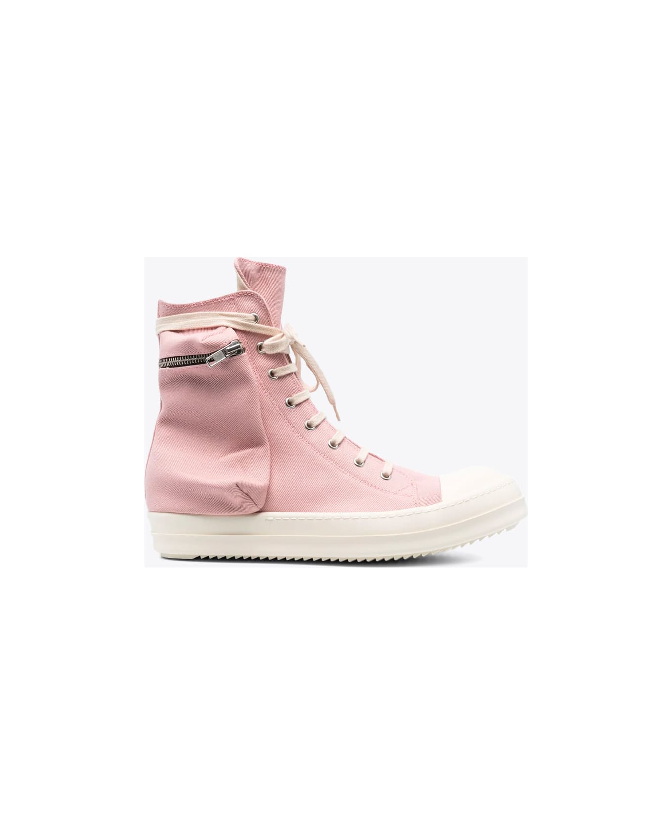 Pink canvas high top cargo sneaker. Lace-up closure with side metal zipper. Side zipper pocket. Off white leather toe-cap and rubber sole. Made in Italy