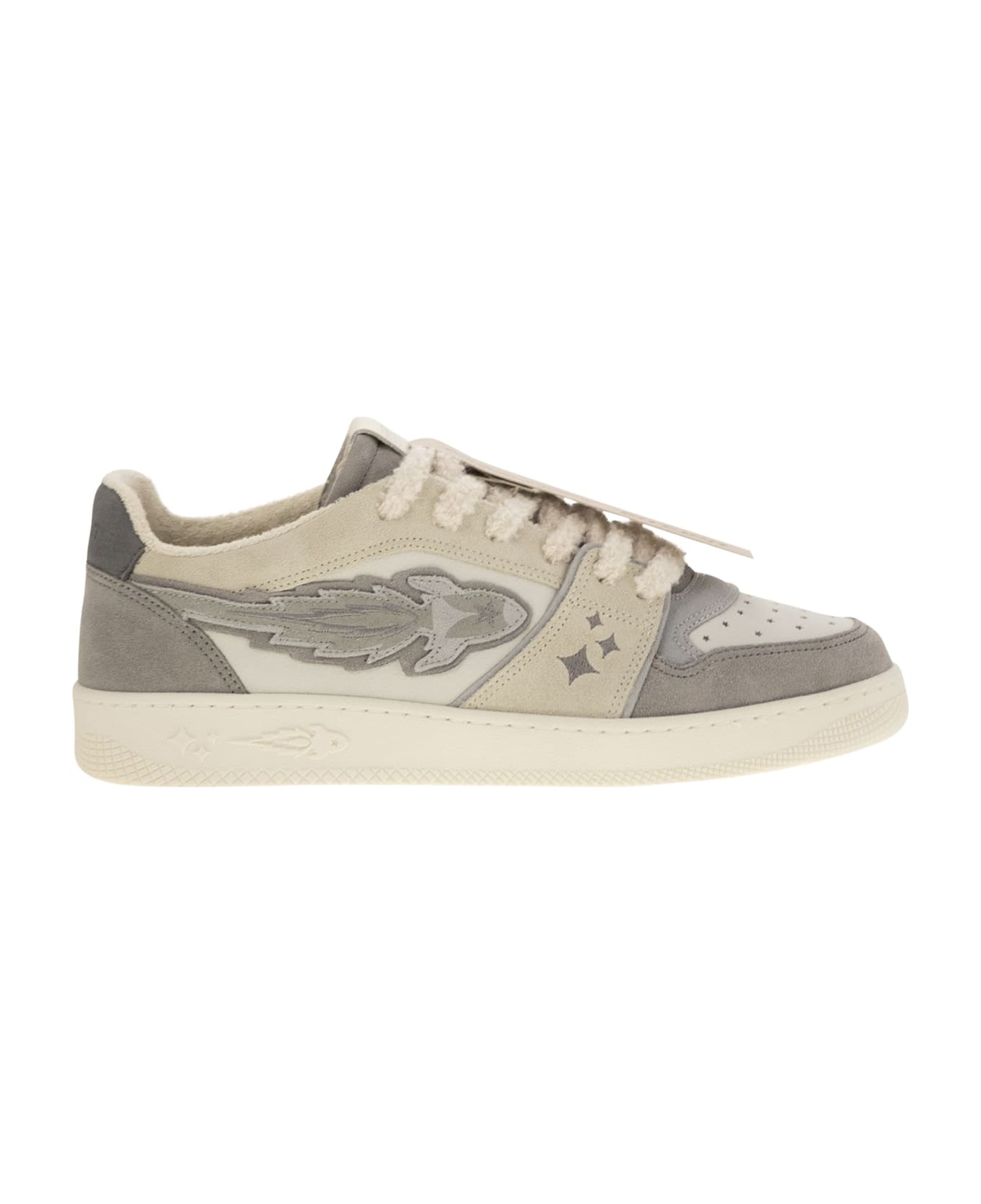 The urban-inspired Egg Rocket trainers are designed to ensure unique style and comfort. Made of leather, it is enriched by the unmistakable Egg Rocket logo, embroidered on the upper with over 2,700 machine stitches and on three different layers of leather. The lightweight thermoplastic sole is customised laterally with embossed graphics and is engraved with the iconic Egg Rocket on the two-tone bottom. - Cotton laces - Made in Italy DESIGNER ID: BB5003PX635S1074 WHITE/GREY