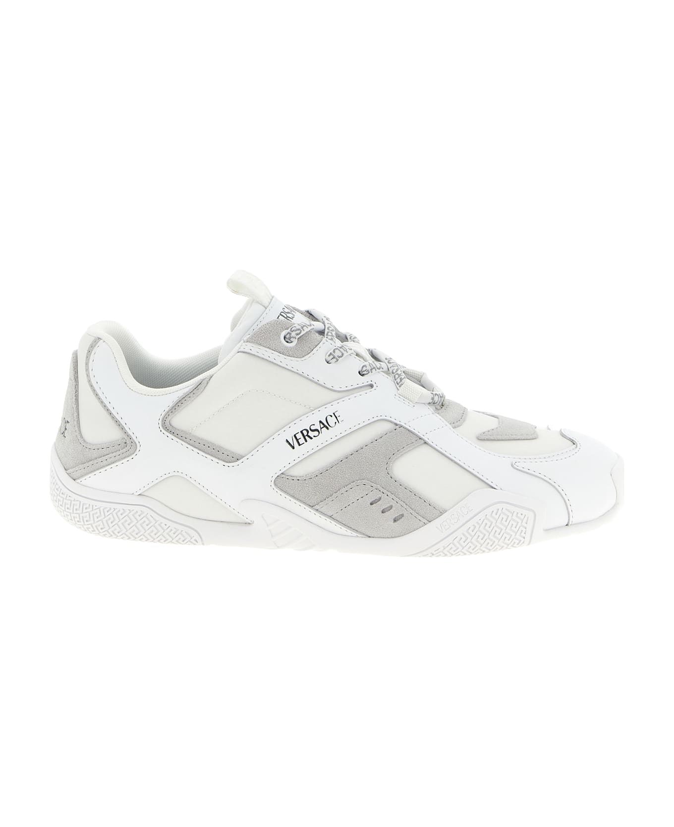 Calfskin, suede and technical fabric sneakers, insole with 'Galaxia' logo print, embossed logo on the tongue and heel, side metal lettering logo, rounded toe, lace-up closure, rubber sole with 'Greca' pattern.