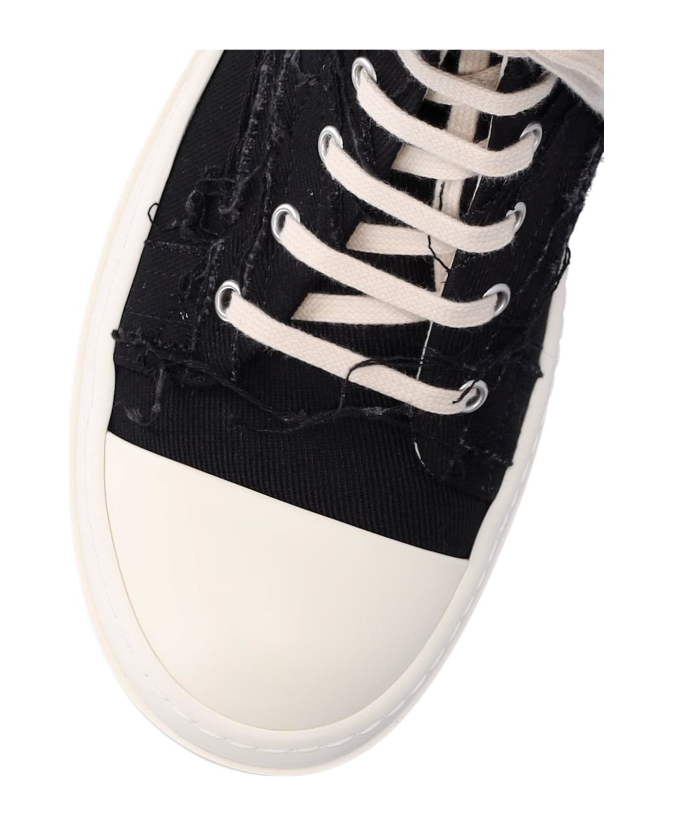 Rick Owens DRKSHDW 'Slashed' sneakers in black fabric with all-over frayed details, white leather round toe, lace-up and side zip, white textured rubber sole.