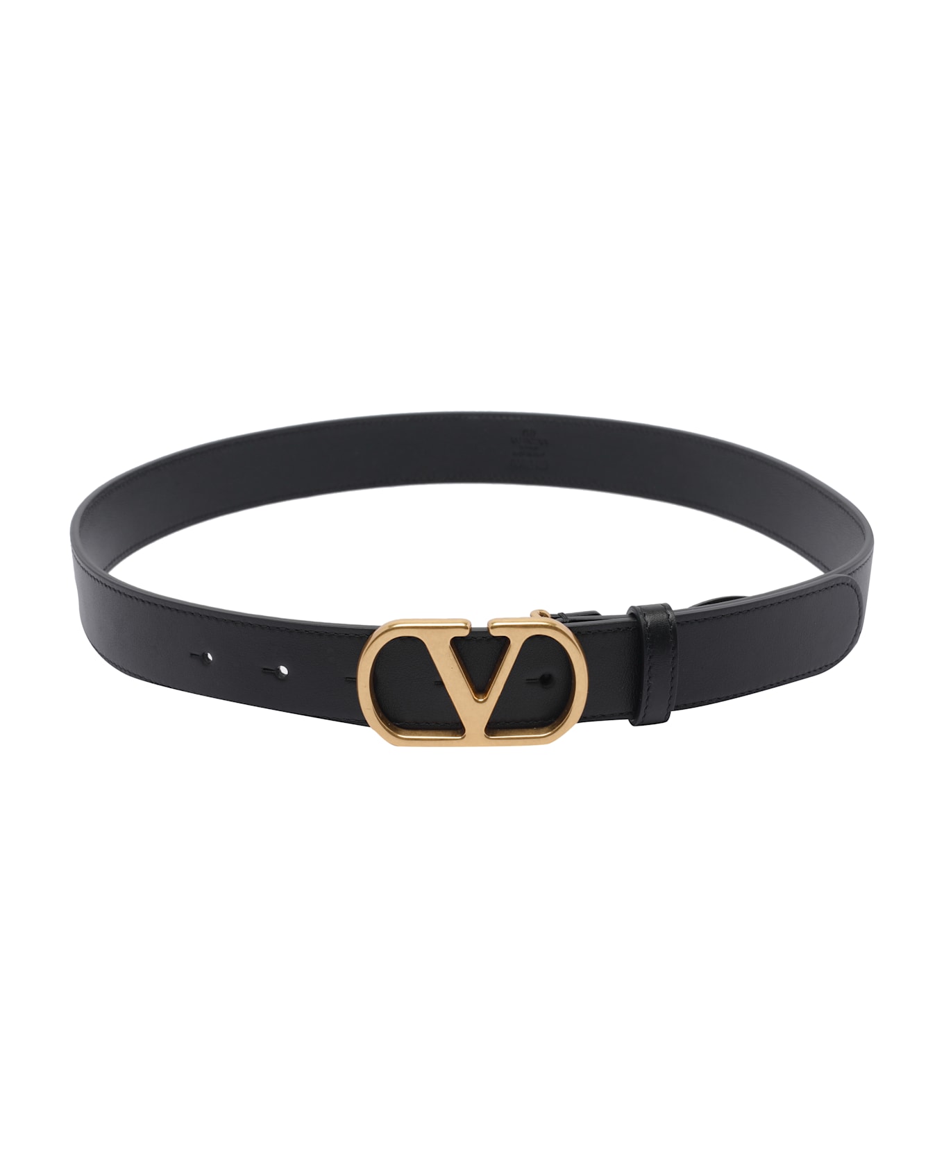 Valentino Garavani black Vlogo Signature belt, frontal golden buckle logo closure
