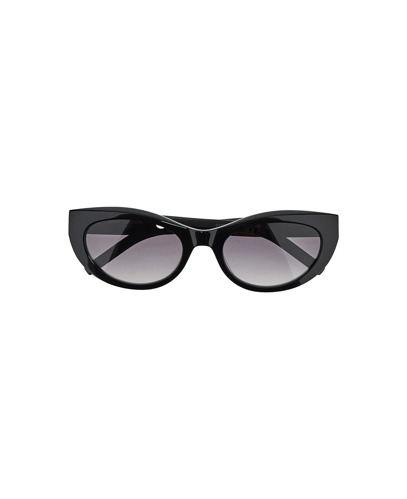 Saint Laurent sunglasses in black acetate with smoke nylon lenses, teardrop shape and gold-finish YSL signature on the rods.