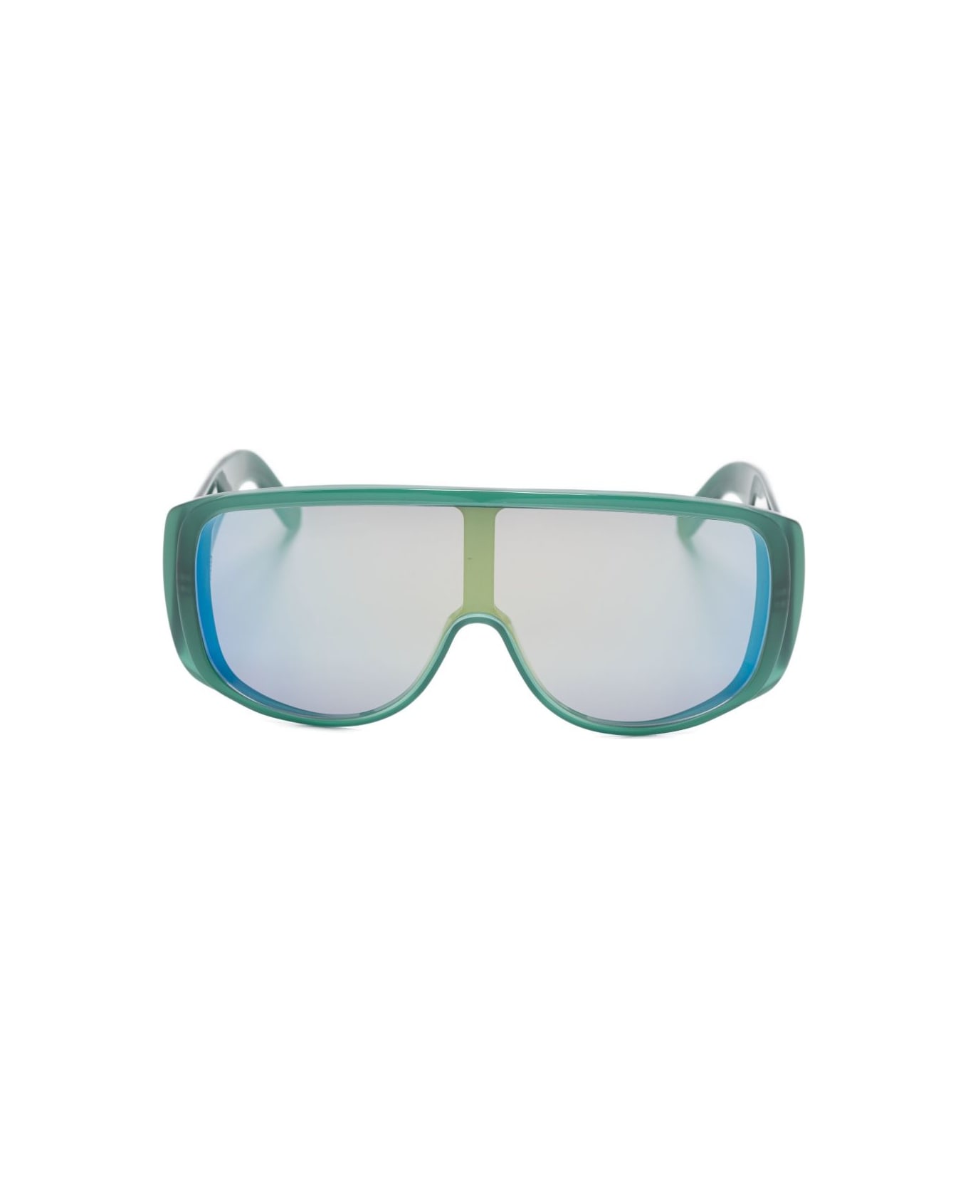 green acetate frame mirrored lenses straight arms curved tips These glasses come with a protective case.