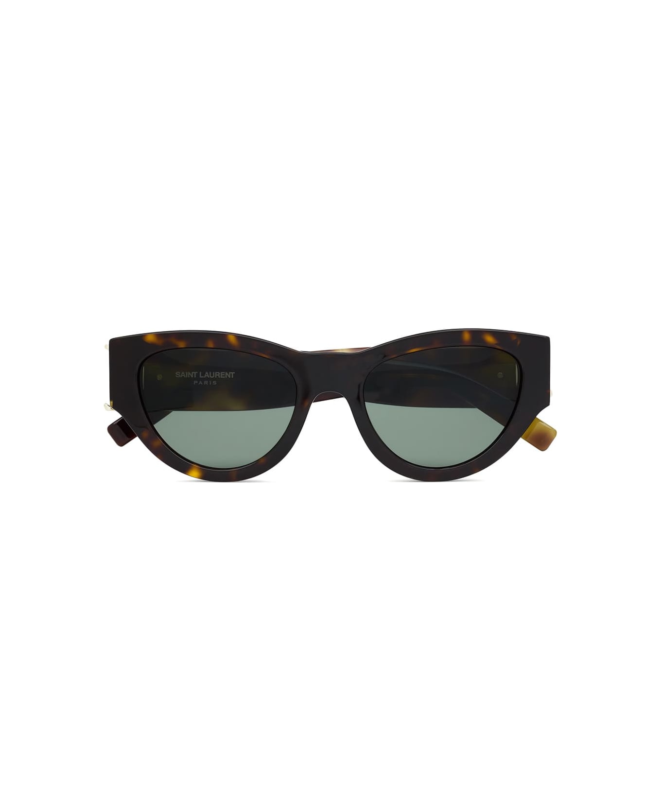 Saint Laurent SL M94-003 - HAVANA (30011895003) are elegant, feminine cat-eye sunglasses made in Italy. They feature havana recycled acetate frame, wide temples with YSL golden monogram hinge, and green lens with 100% UV protection.