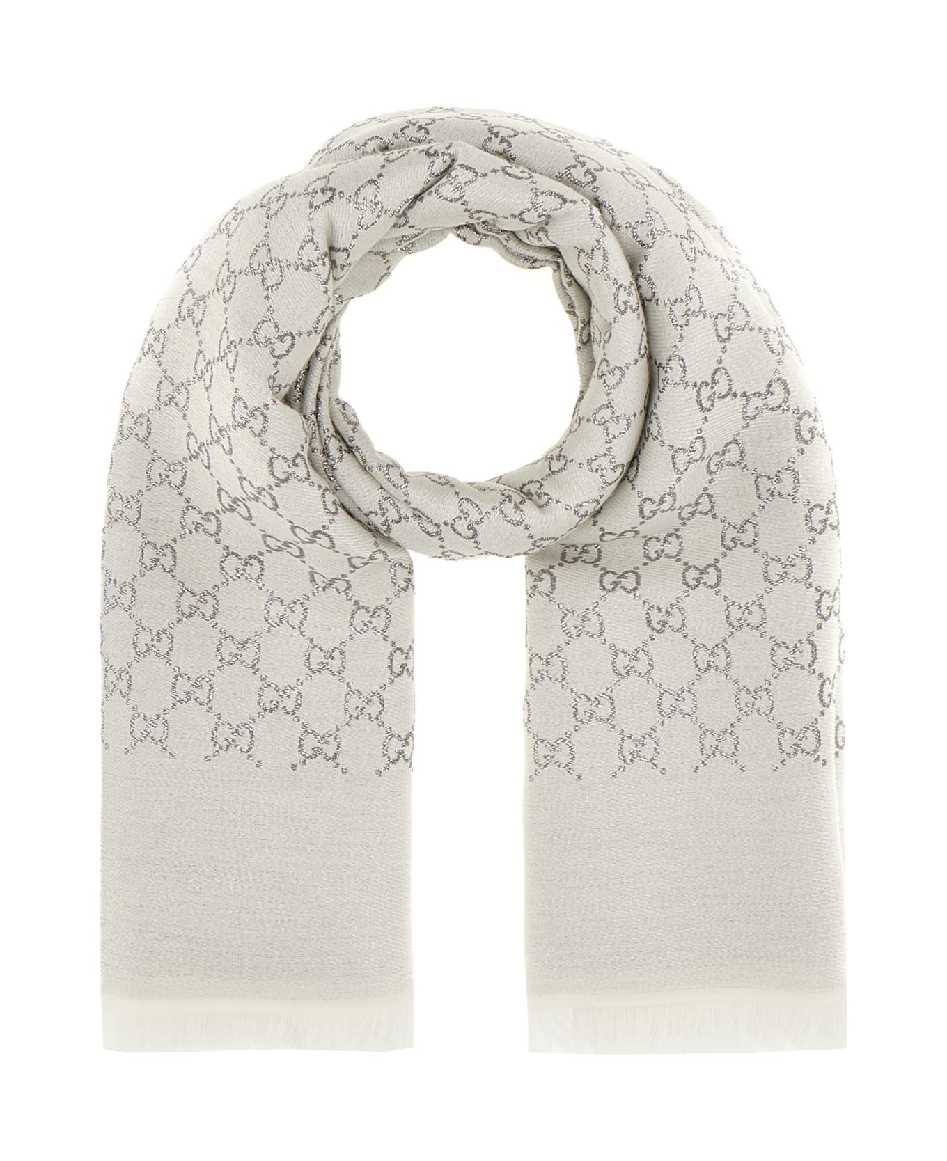 Reversible scarf realized in wool blend characterized by GG motif embroidery and lurex threads on the entire surface. -Fringed ends