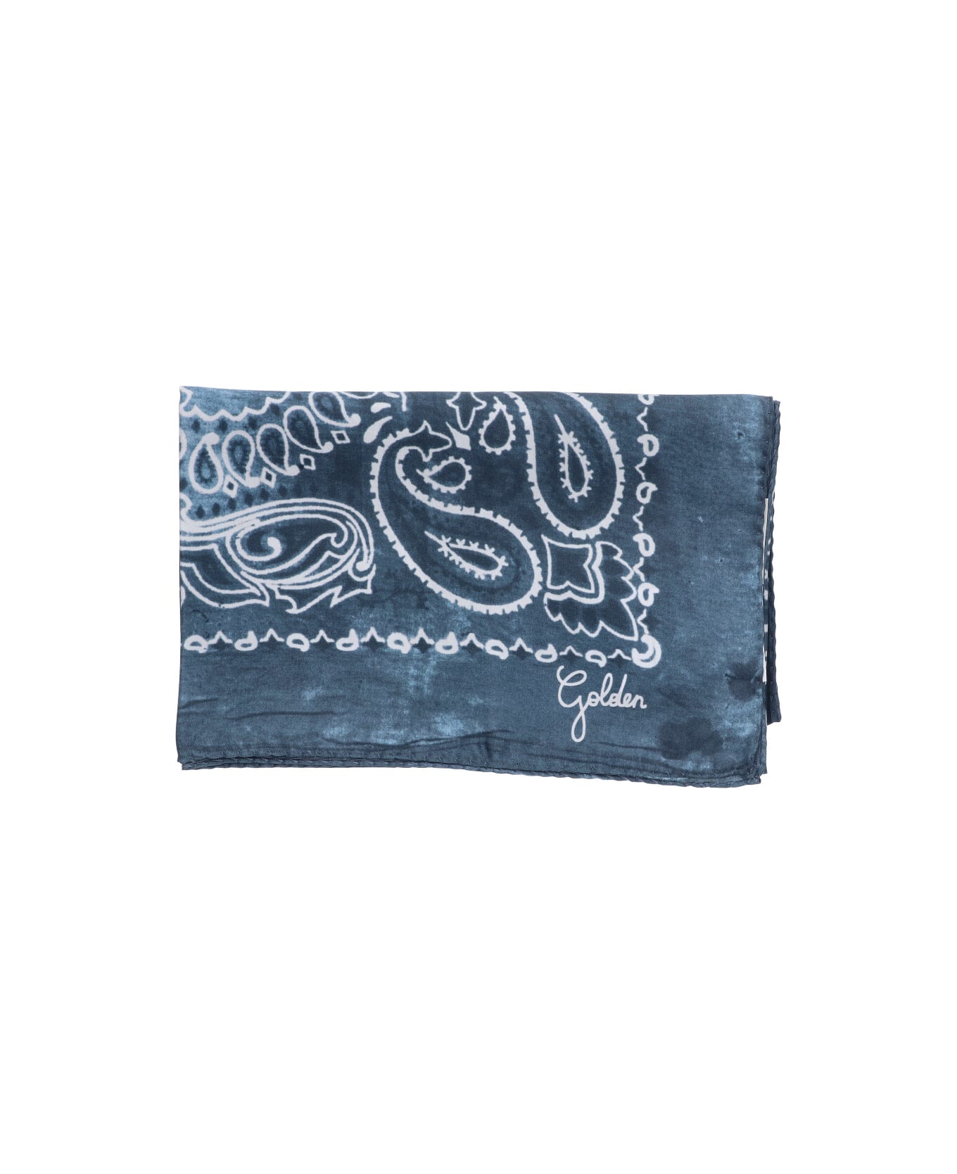 Silk scarf by Golden Goose, blue, square design. all-over "Paisley" pattern, contrasting logo print on the front. Composition: 100% Silk