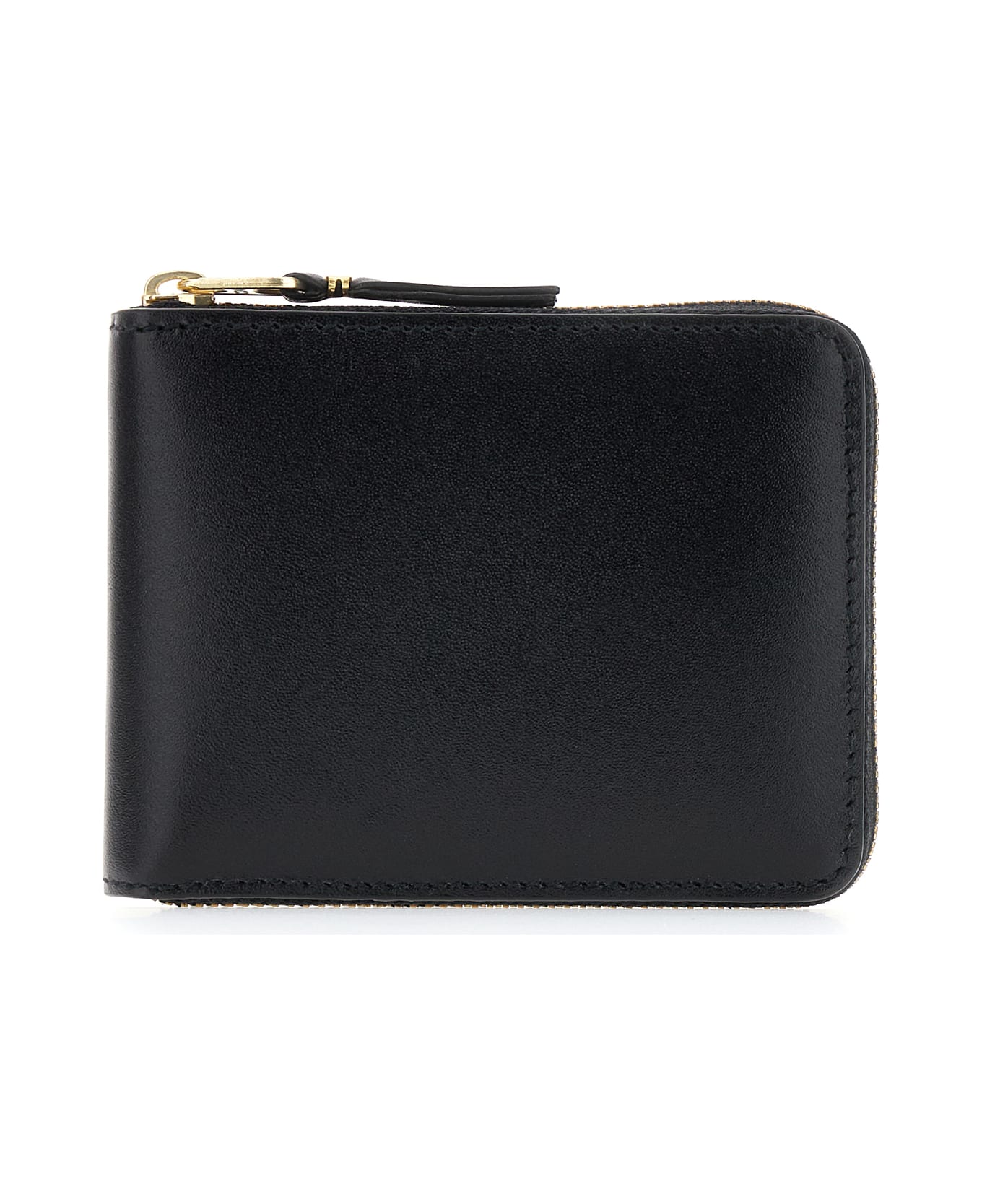 Wallet realized in smooth leather characterized by zip around closure. -Interior with a bill compartment, a coin pocket, a slit pocket and three credit card slots
