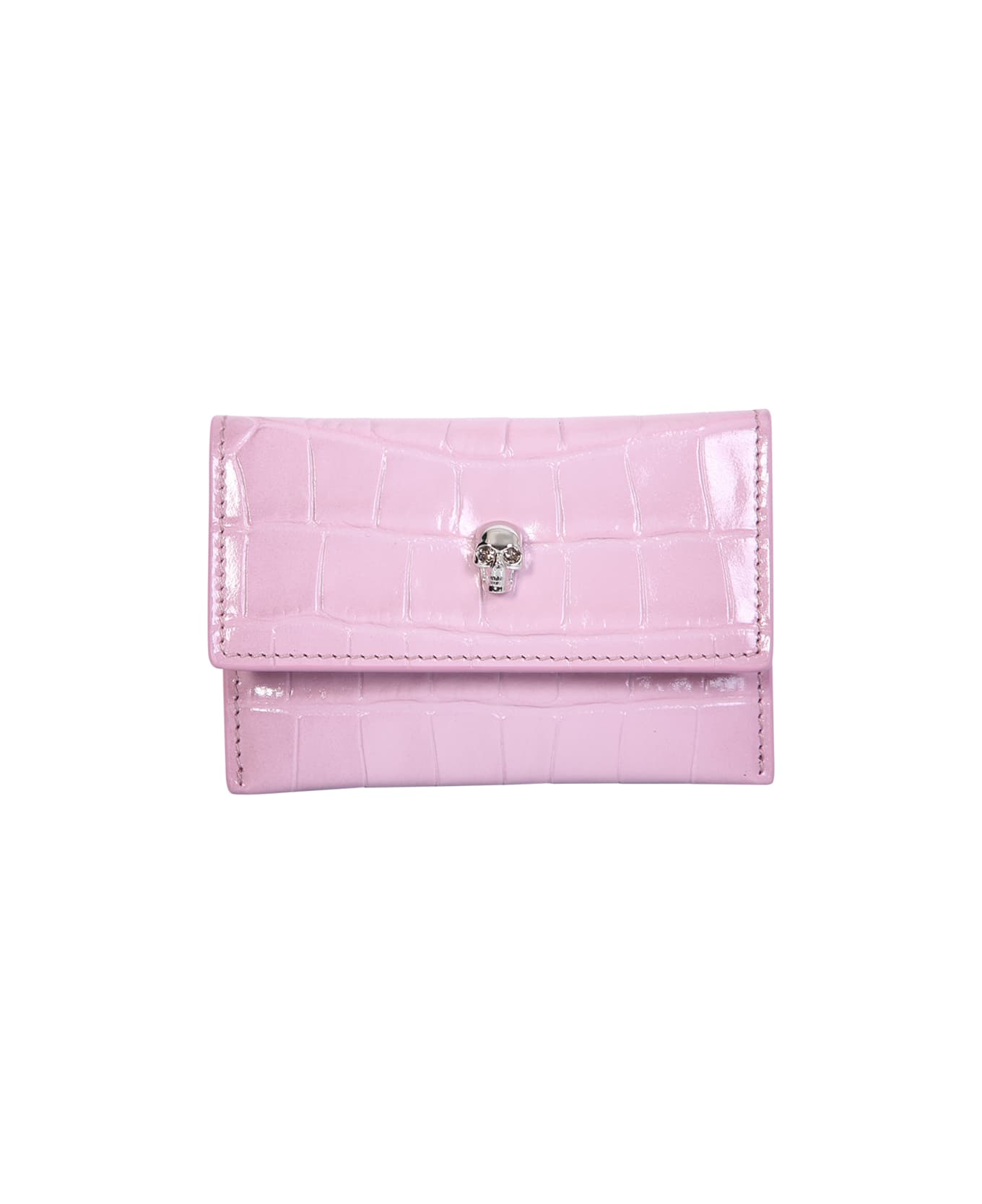 Embossed crocodile effect. Skull stud detailing. Silver tone logo lettering. Foldover top with press stud fastening. Main compartment. Color: Rose pink