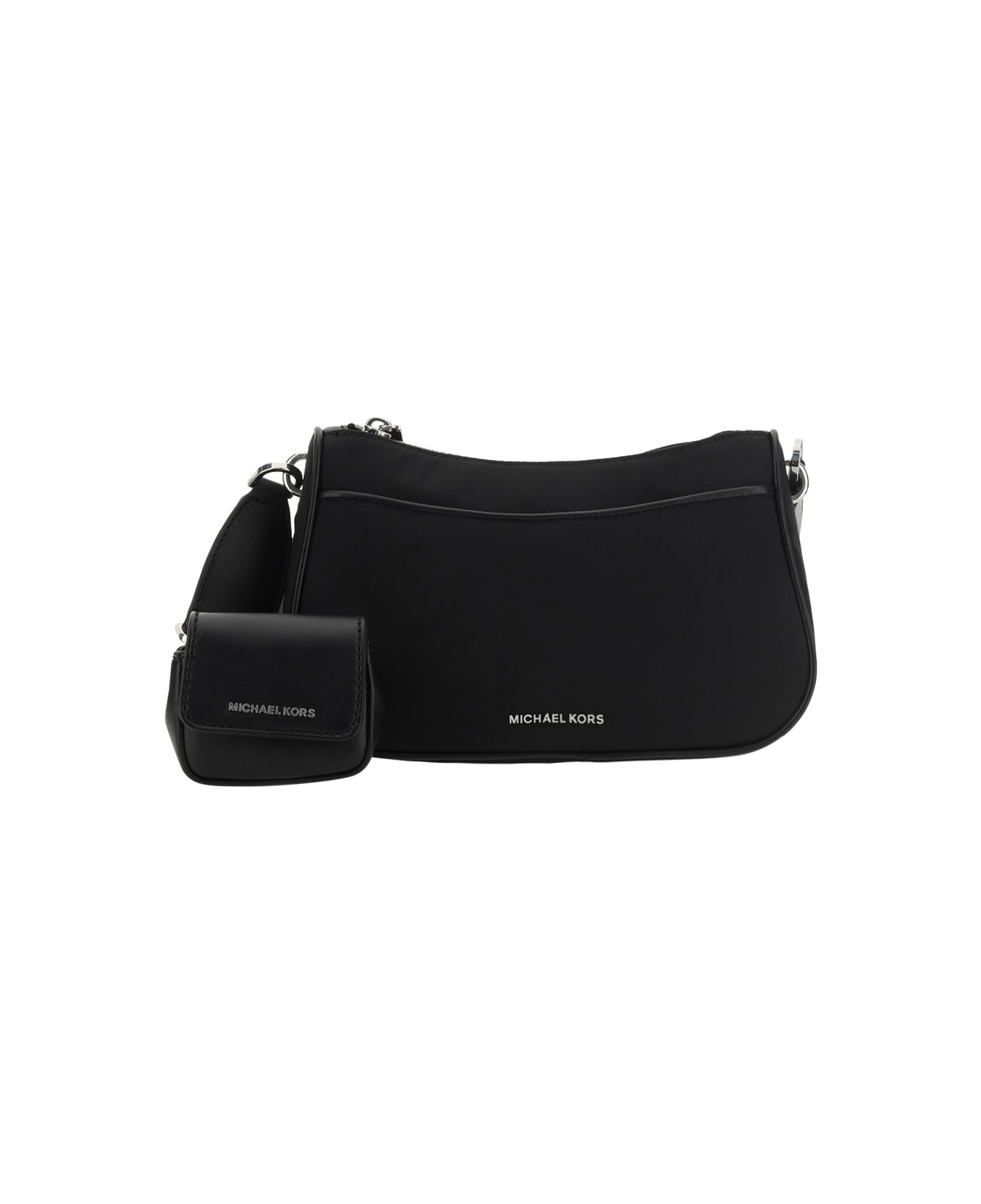 Jet set shoulder bag by michael kors, zippered top closure, removable and adjustable flat webing shoulder strap, embossed iconic brand monogram plaque on front, removable pouch attached to bag's shoulder strap, single interior compartment, interior welt pocket.