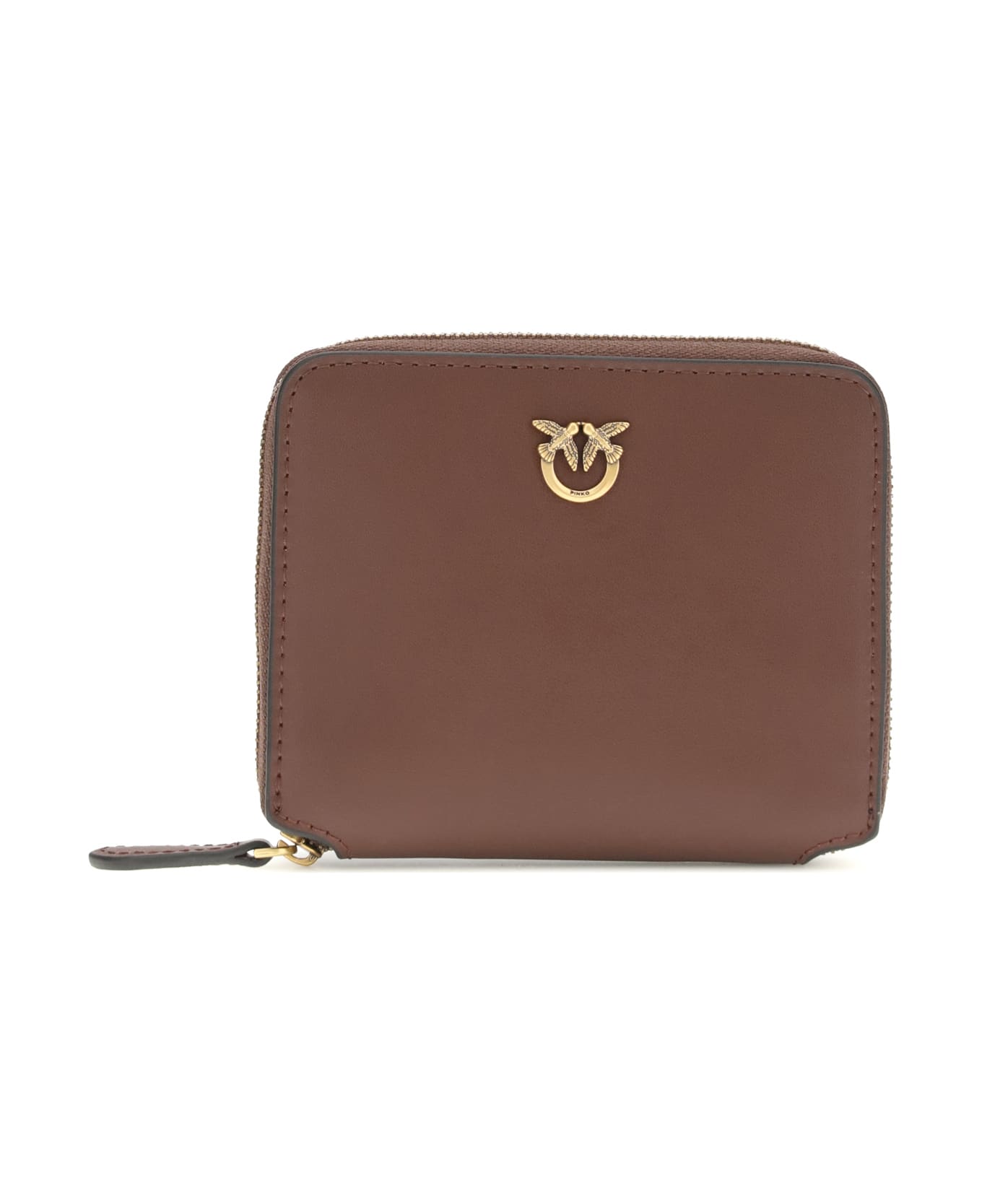 The leather zip-around wallet by pinko is a compact and refined accessory made of soft leather and featuring the love birds diamond cut plaque on a leather base. the zipper closure provides security, while the polycotton-lined interior offers practicality and organization.