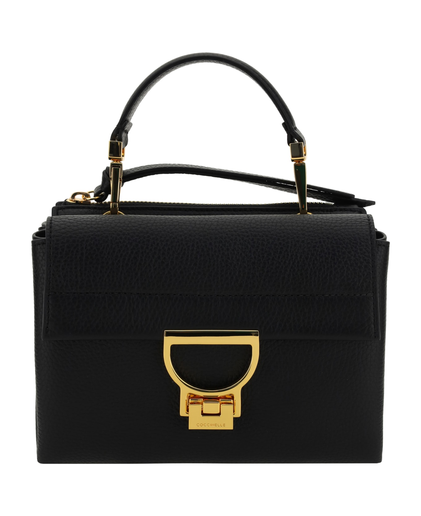 Calfskin arlettis handbag by coccinelle, rigid leather top handle, removable and adjustable flat shoulder strap, contrasting applied brand monogram plaque on the back, front flap closure with gold-plated metal interlocking system, garnet leather design, second compartment on the back with top zip for closure.