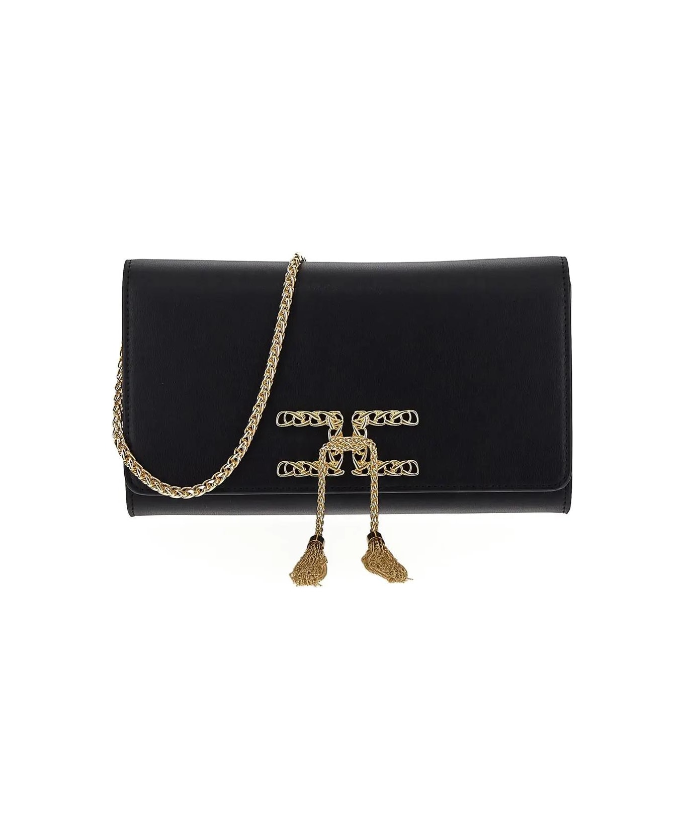 Elisabetta Franchi maxi pouch bag in black smooth faux leather with golden-finish metal logo and tassel details, detachable chain shoulder strap, flap with magnetic closure, a main compartment, zipped pocket, flat pocket and gold-toned metal hardware.