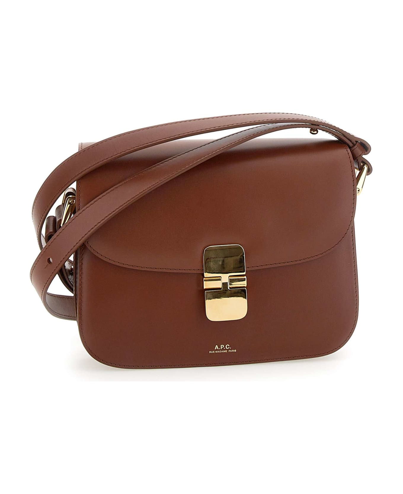 Shoulder bag A. P. C. "Grace Small" smooth cowhide, tobacco color, trapeze shape, flap and snap hook fastening, suede and cotton lining, gold-colored "APC rue Madame Paris" logo embossed on front, adjustable shoulder strap, one main compartment, trims metallic gold. Dimensions: length 21. 5cm, height 7cm, depth 5cm. Fabric case included.